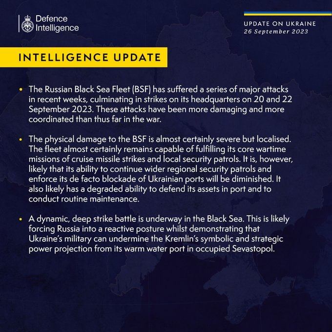 В Минобороны Британии отмечают, что в последние недели ЧФ рф подвергся ряду серьезных атак, кульминацией которых стали удары по штаб-квартире 20 и 22 сентября. Ущерб такие атаки нанесли серьезный, но локальный, поэтому флот почти точно сохраняет способность выполнять свои основные задачи - ракетные удары и патрулирование.