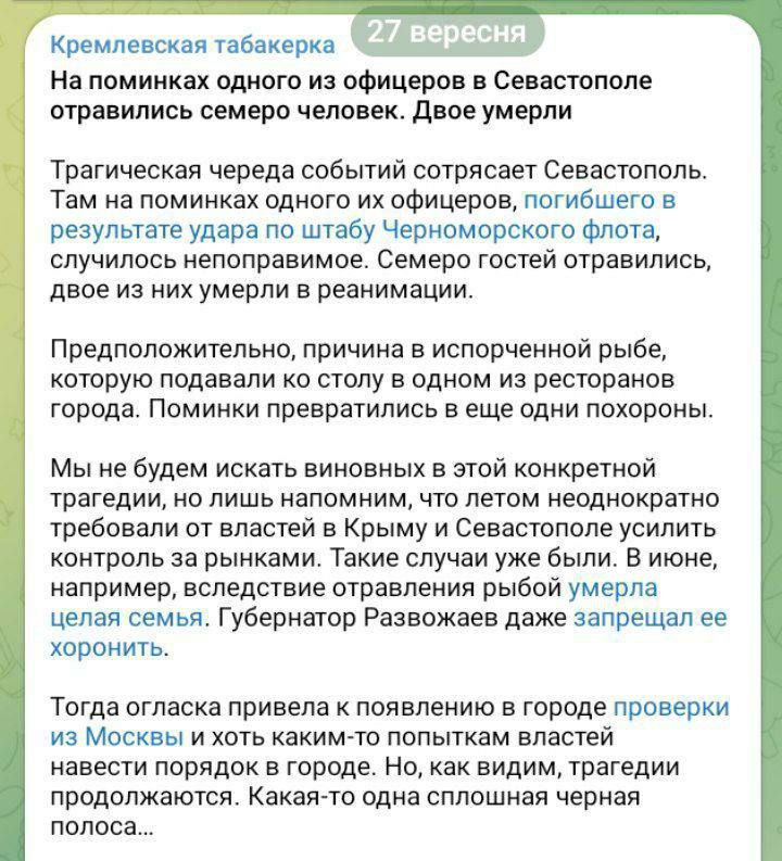На поминках одного з офіцерів у Севастополі, рибою отруїлися семеро людей. Двоє померли, — росЗМІ