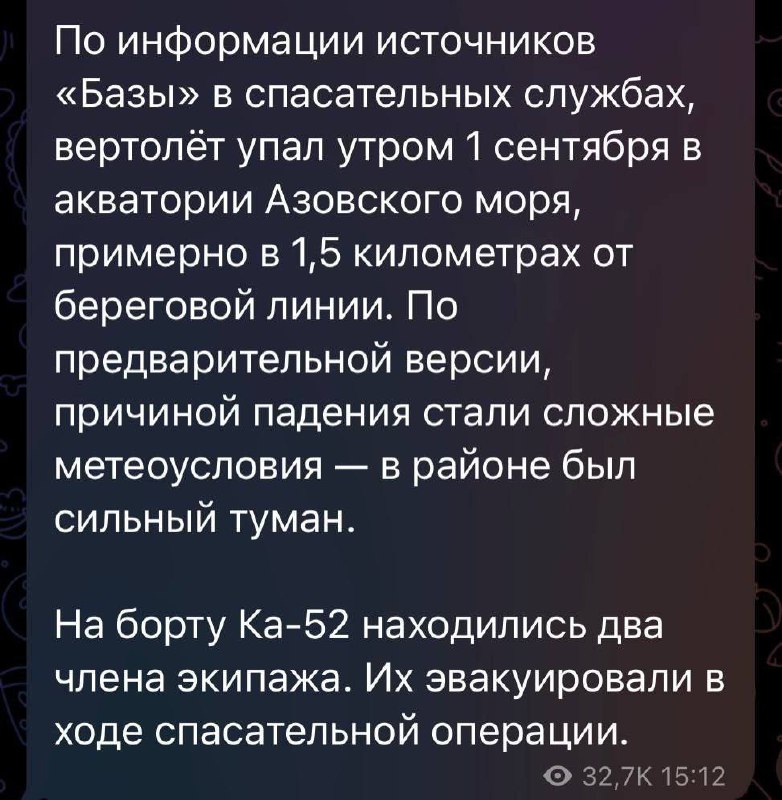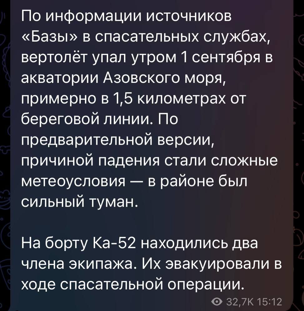The helicopter went down in the morning of September 1 in the waters of the Sea of Azov, about 1.5 km from the coastline. There were two crew members on board the Ka-52. According to Rossmi, they were evacuated during the rescue operation.
