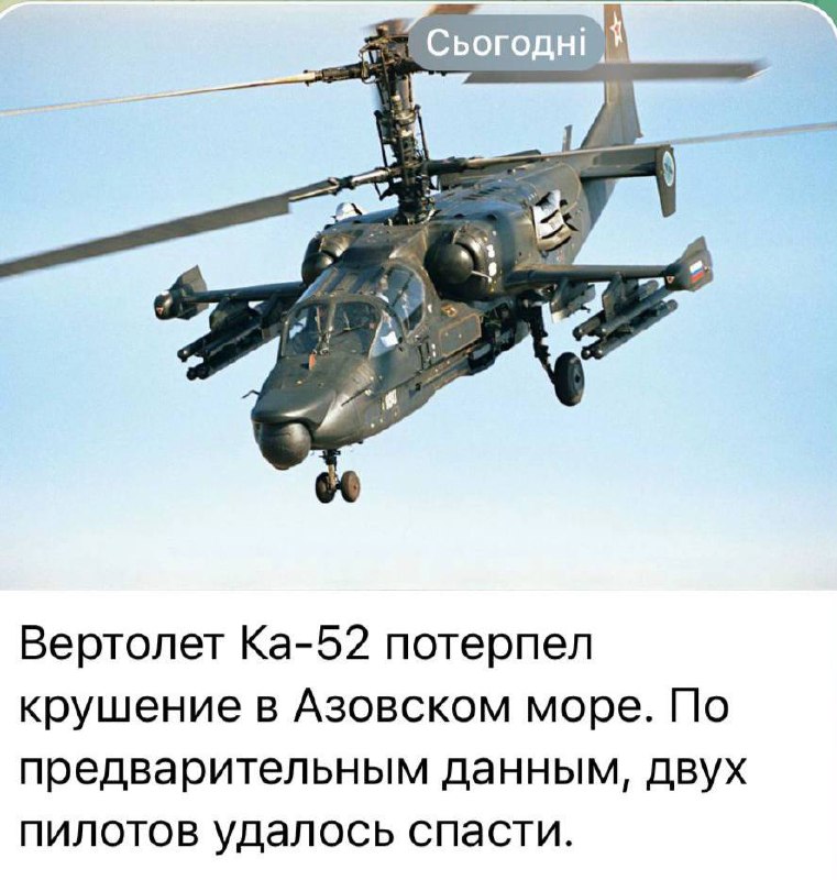 A Ka-52 helicopter crashed in the Sea of Azov. Unfortunately, two pilots were rescued...