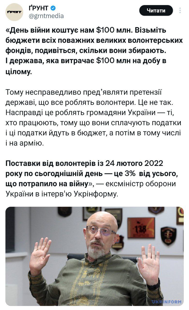 При этом Резников уточнил, что поставки от волонтеров с 24 февраля 2022 года по сей день - это 3% от всего, что «попало на войну».