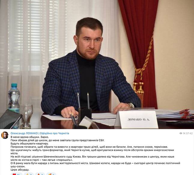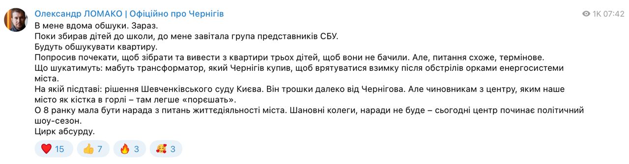 «Що шукатимуть: мабуть, трансформатор, який Чернігів купив, щоб врятуватися взимку після обстрілів», — написав чиновник, назвавши обшуки «цирком абсурду».