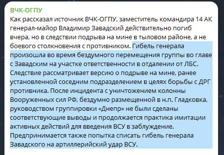 Russian Z publics, classified by the Russian Defense Ministry as "negative", report that Russian General Zavadsky exploded on a mine in the rear and deprived him of the possibility of "posthumous heroization". Because it turns out that the general died not on the front line, but somewhere in the rear, and then because of the imitation of violent activity 😃 We need to send Zavadsky's relatives a screenshot from the Russian channel, his son also chose a career in the military, so let him read about the prospect of repeating his father's "success".