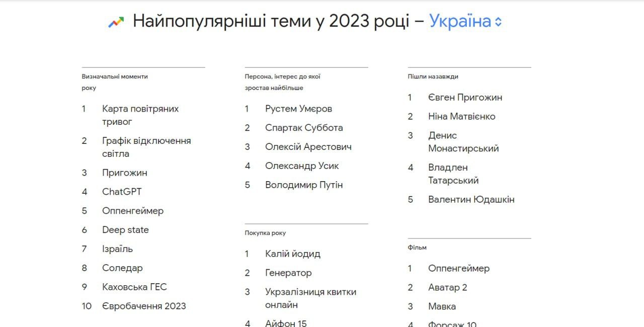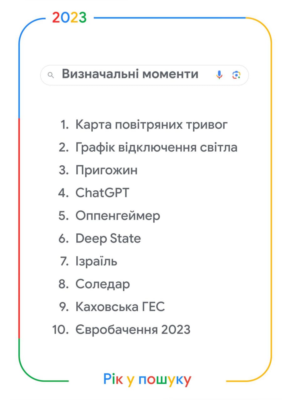 Серед визначальних моментів року першу позицію посів запит «Карта повітряних тривог». У рейтингу персон першу сходинку посів міністр оборони Рустем Умєров. Щодо людей, які пішли назавжди, найбільше запитів було про Євгенія Пригожина. У категорії «Фільми» найбільше запитів на стрічку «Оппенгеймер». Серед серіалів — «Венздей».