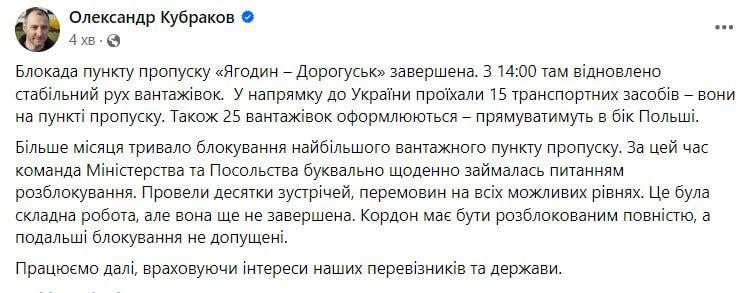 Kyivstar will resume operations in four to five hours, says Deputy Prime Minister Kubrakov.