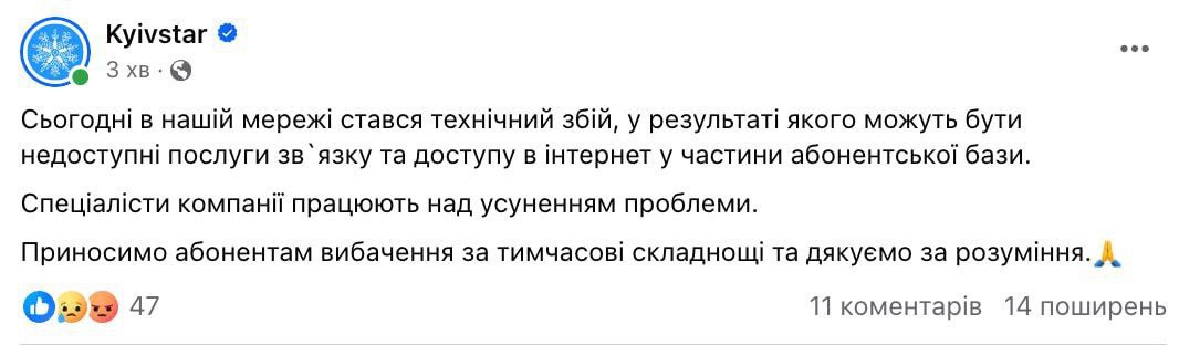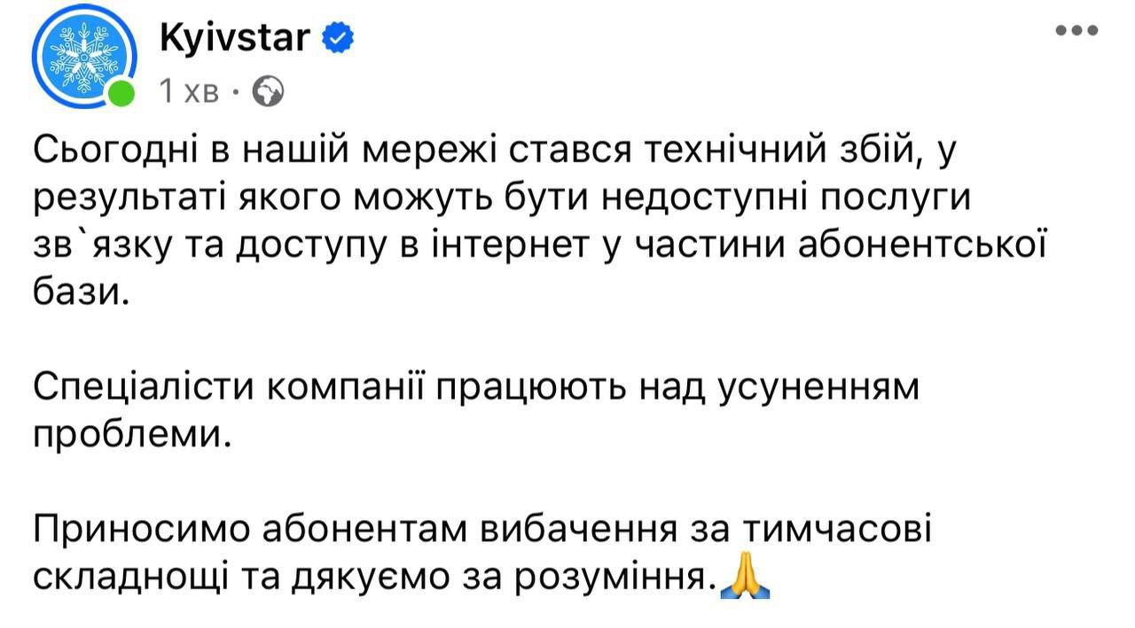 ▪️У користувачів відсутній звʼязок, домашній та мобільний інтернет. Абоненти не можуть перейти на іншого оператора. Збій вплинув на національний роумінг, заявили у Мінцифри.