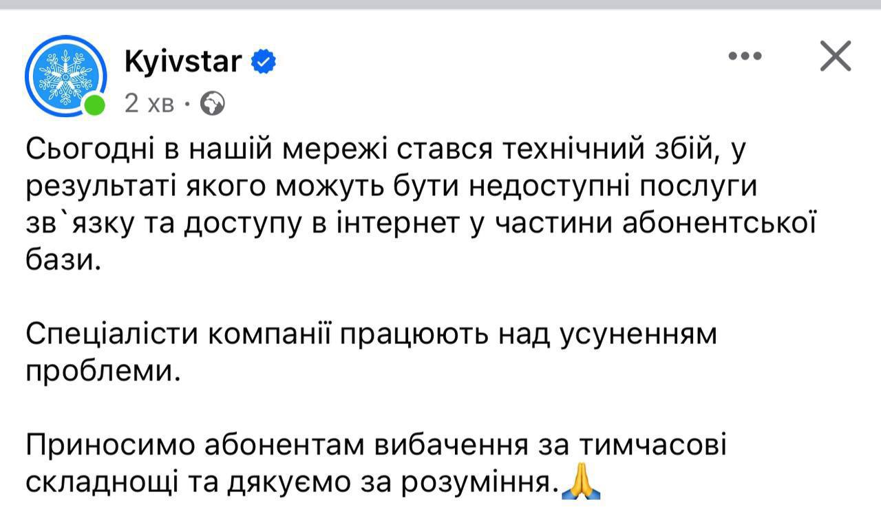 "Kyivstar has been subjected to a hacker attack, according to the Suspilne company.
