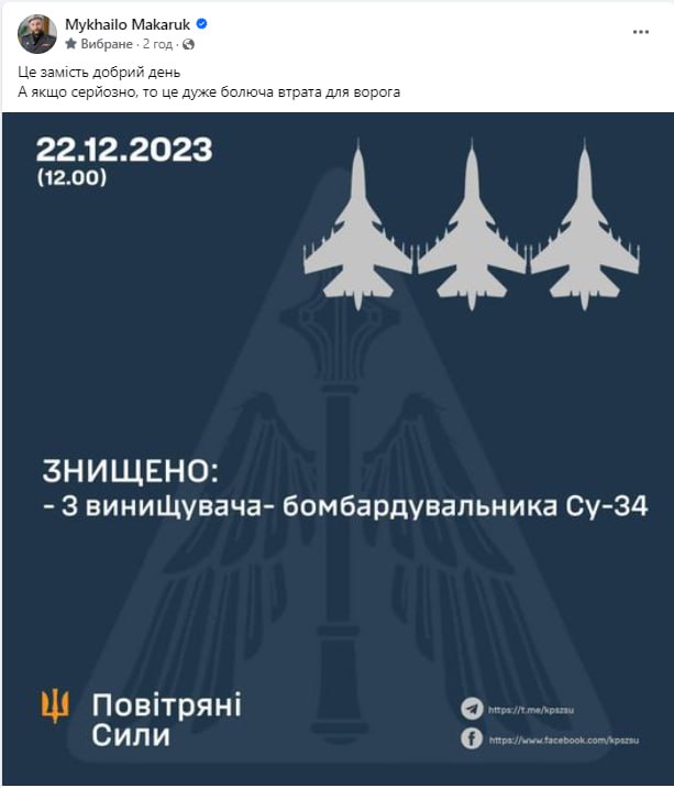 🇺🇦 The Ukrainian Air Force shot down three Russian Su-34 fighter-bombers in the southern direction.