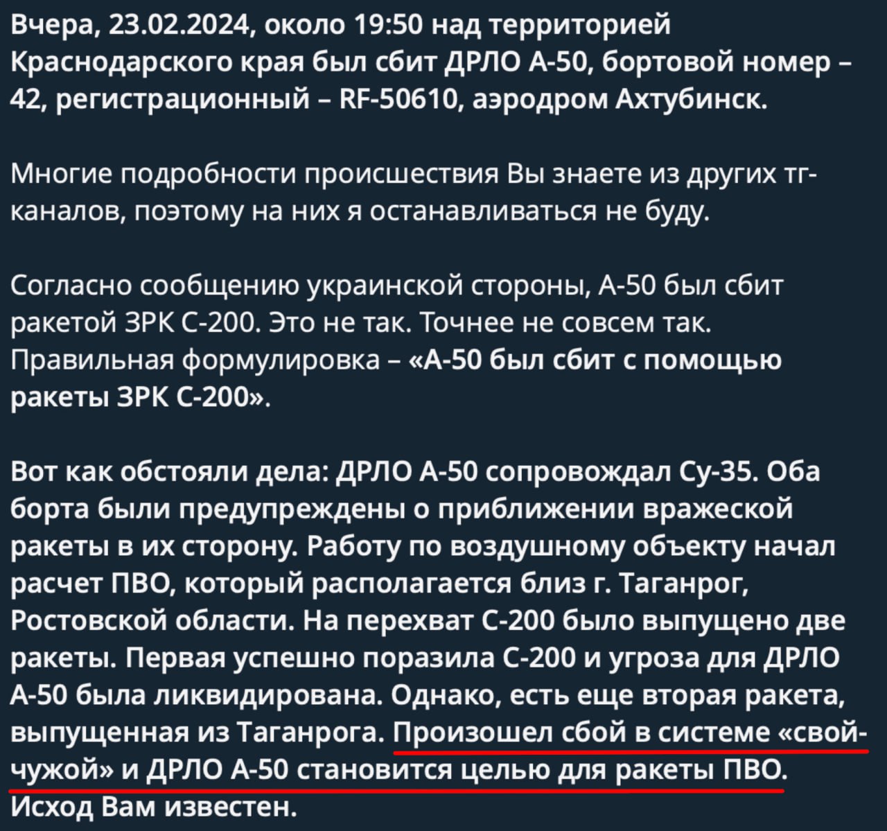 🛫 Останній зліт А50У здійснив 23 лютого 2024 року о 15:50 з аеродрому «ахтубінск» та мав виконувати терористичні завдання держави-агресора росії поблизу населених пунктів пріморско-ахтарск ― зєрноґрад.