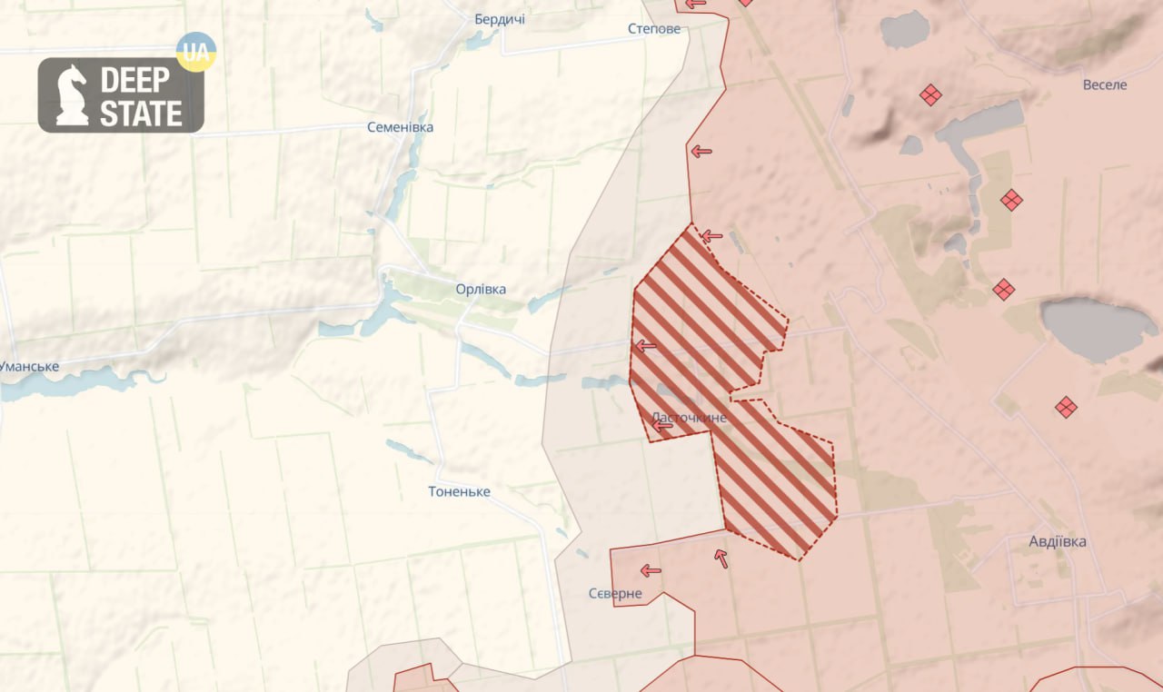 The day before, DeepState reported that Russians had occupied Lastochkine in Donetsk region and were now continuing to put pressure on Severne and Orlivka. However, the morning report from the General Staff says that the Ukrainian military repelled a number of attacks near the village of Lastochkine.