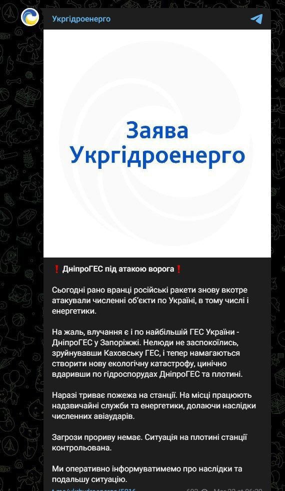 ❗️У In Zaporizhzhia, there were two direct hits at the DniproHES - at HPP-1 and HPP-2. It is not known whether HPP-2 will be restored, it is seriously damaged - statement by Ukrhydroenergo CEO Ihor Syrota