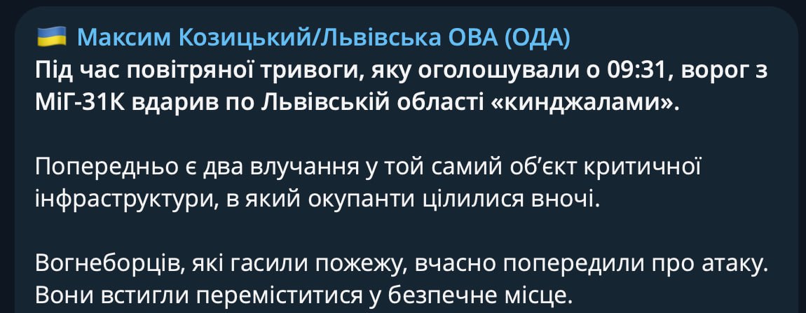 ▪️ворог from MiG-31K repeatedly struck Lviv region with "daggers"