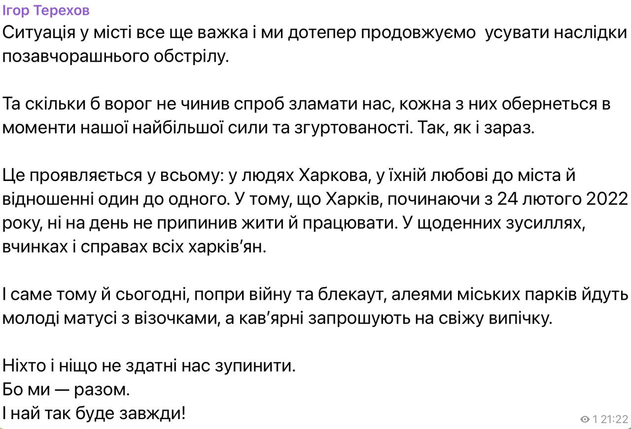 "For the second day we have been trying to localize the consequences of the enemy's largest-scale attack on the city's power system and return electricity to Kharkiv residents' homes. However, this depends on many variables: technical, logistical, and production capabilities, which, unfortunately, cannot be accurately predicted in advance," said Igor Terekhov.