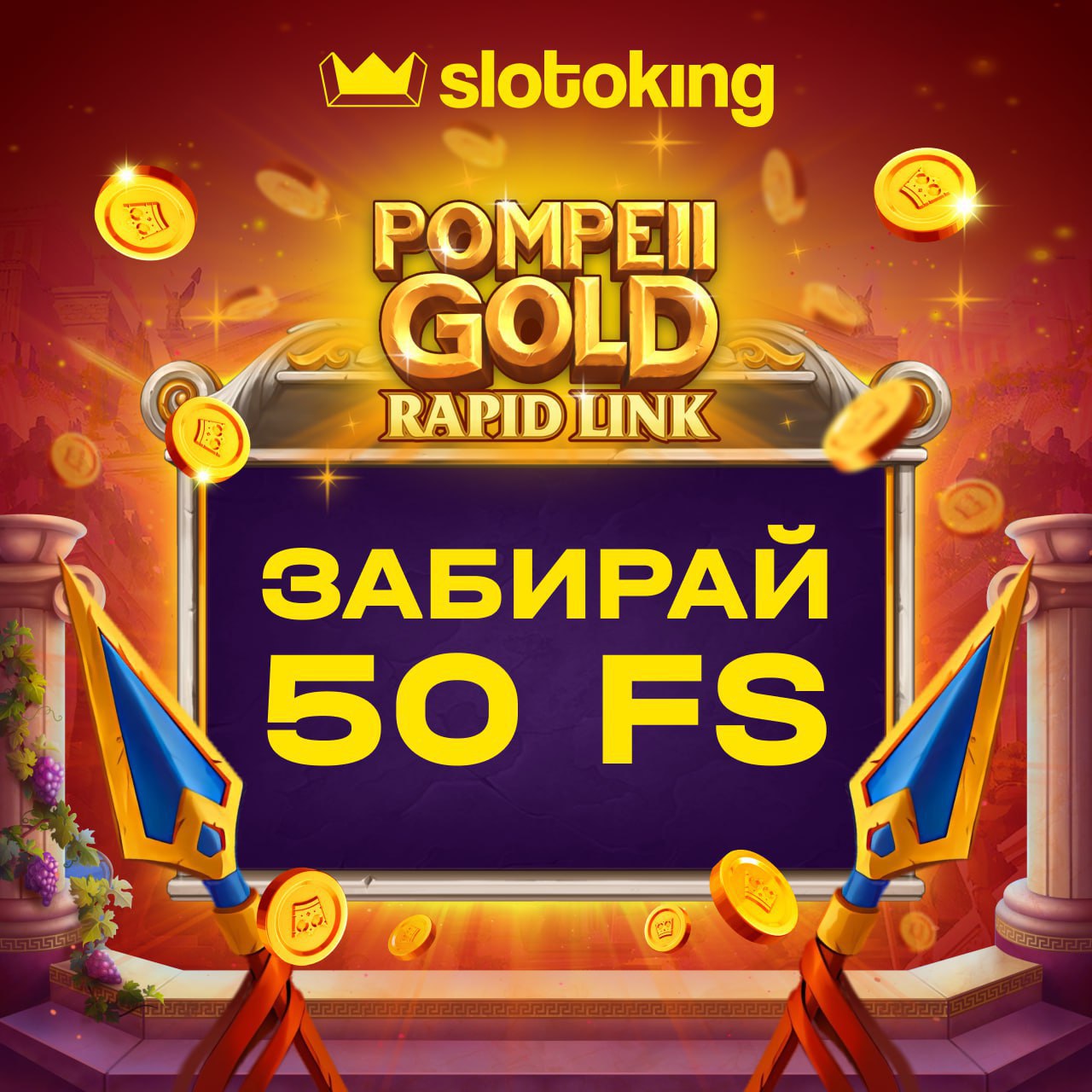 🤩Ловіть унікальний бонус - 50 FS у Pompeii Gold: Rapid Link для гри від українського ліцензійного онлайн-казино slotoking!