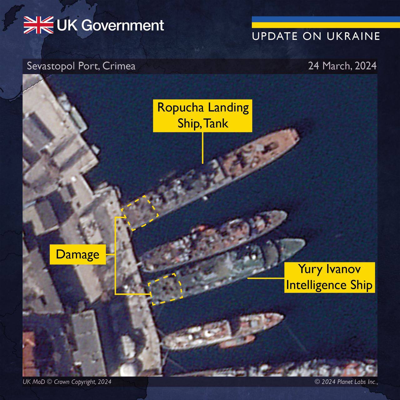 Міноборони Британії показало детальний, якісний супутниковий знімок уражених українськими ракетами російських кораблів «Іван Хурс» і ВДК «Азов» під час атаки на Севастополь 24 березня. На знімку добре видно, що влучили в корму кораблів.