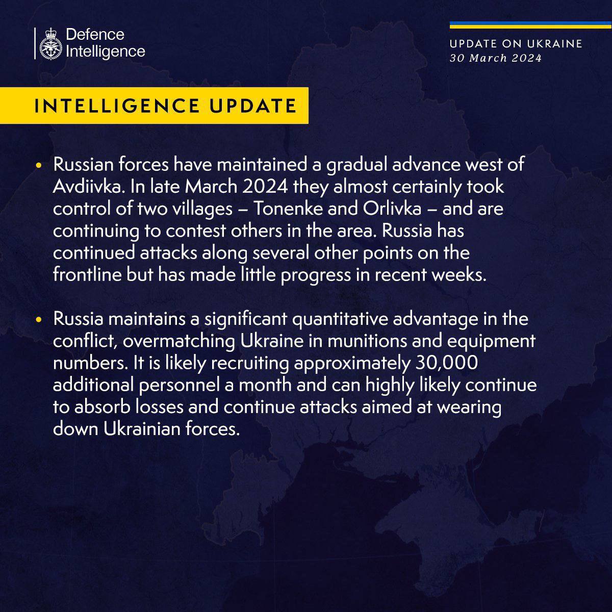 ℹ️ Щомісяця ереф набирає 30 000 нових солдатів для підтримки війни в Україні. Загарбники мають значну кількісну перевагу у техніці та боєприпасах, — Defence Intelligence