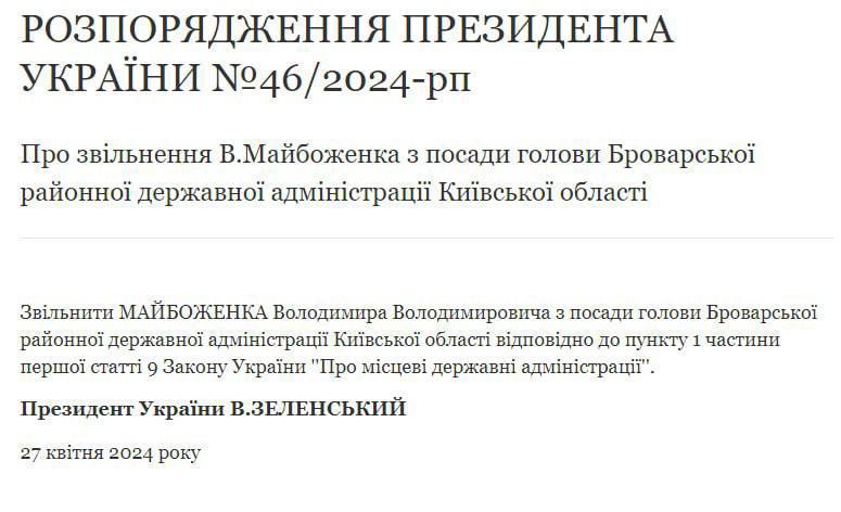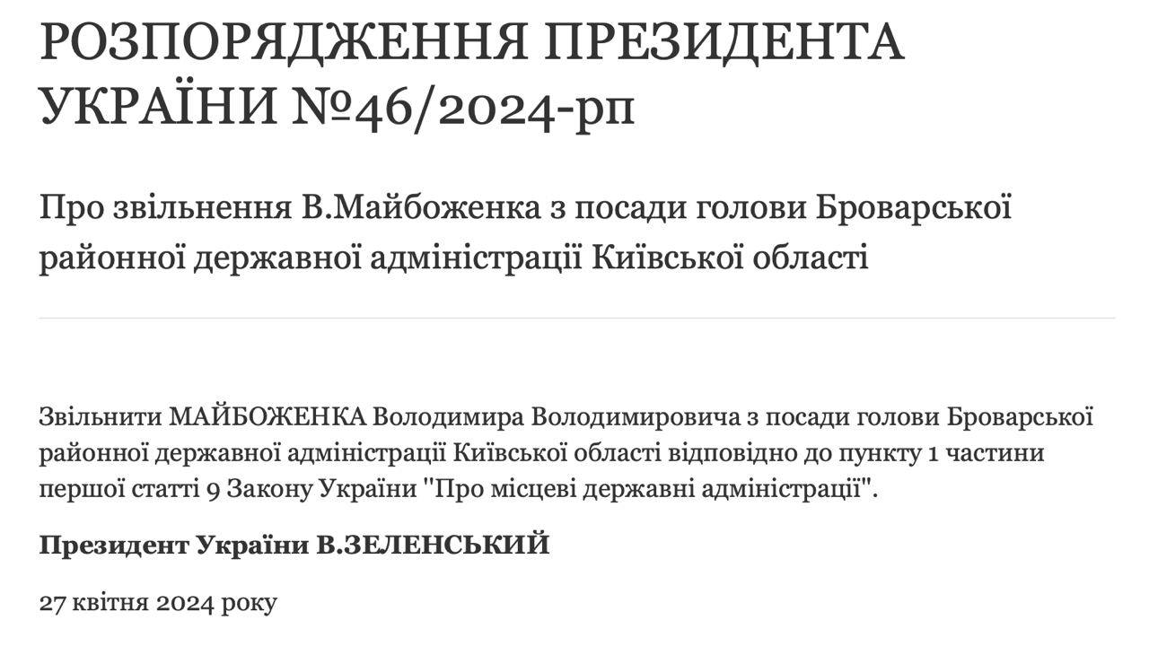The Prosecutor General's Office has imposed a 2-month custodial sentence on Volodymyr Maibozhenko, the head of Brovary District State Administration, who hit four people with his car yesterday.
