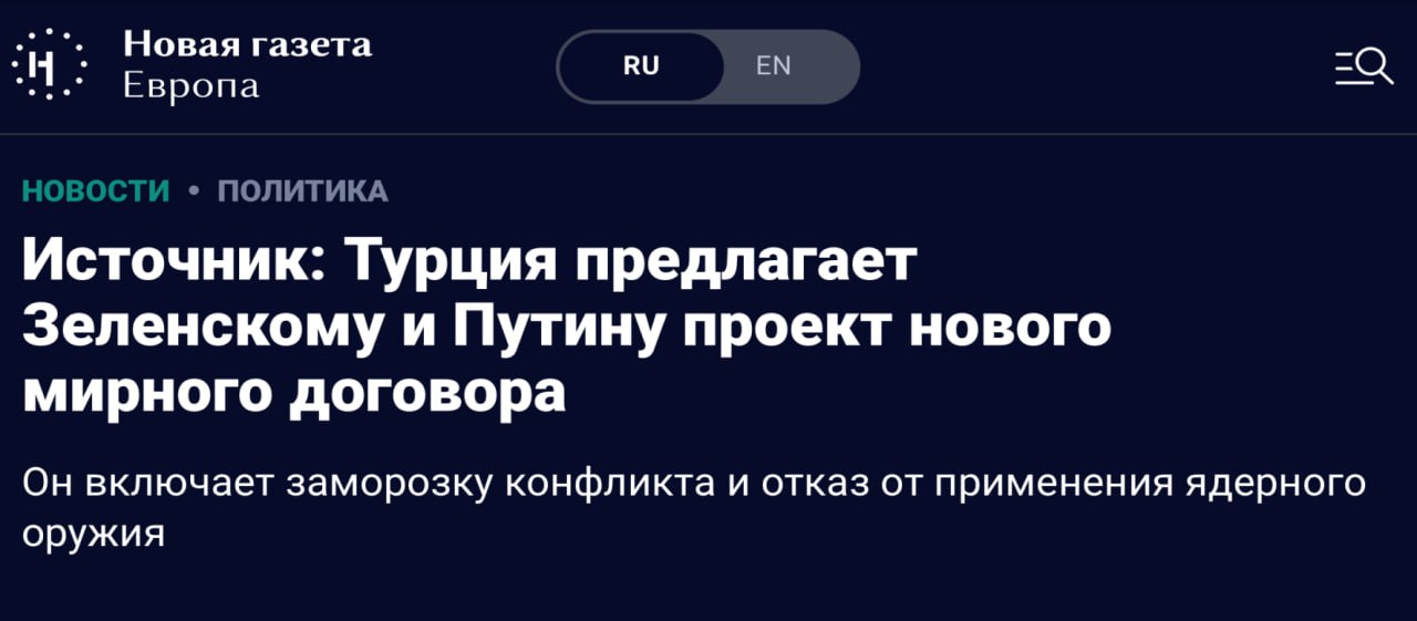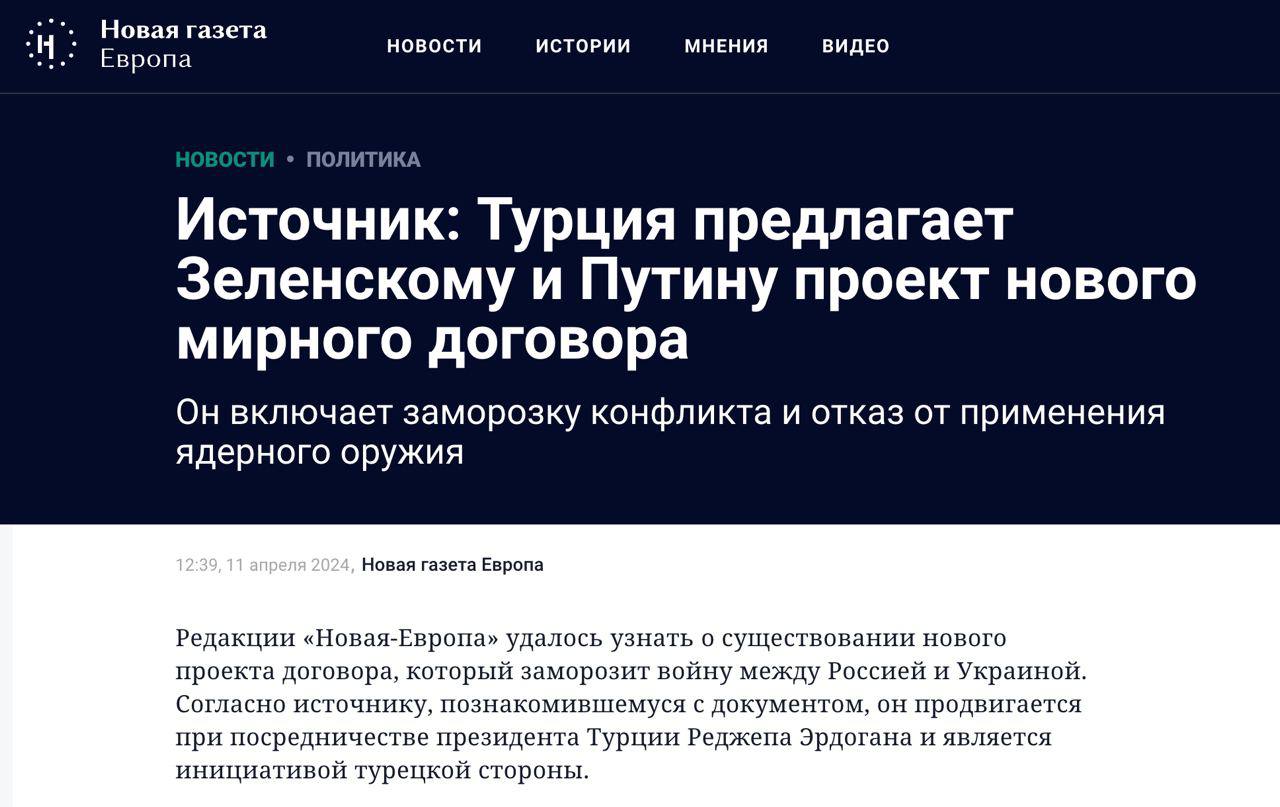 Напередодні російське емігрантське видання «Новая газета Европа» оприлюднило план замороження війни, який нібито був запропонований Україні та рф Президентом Туреччини Реджепом Ердоганом.