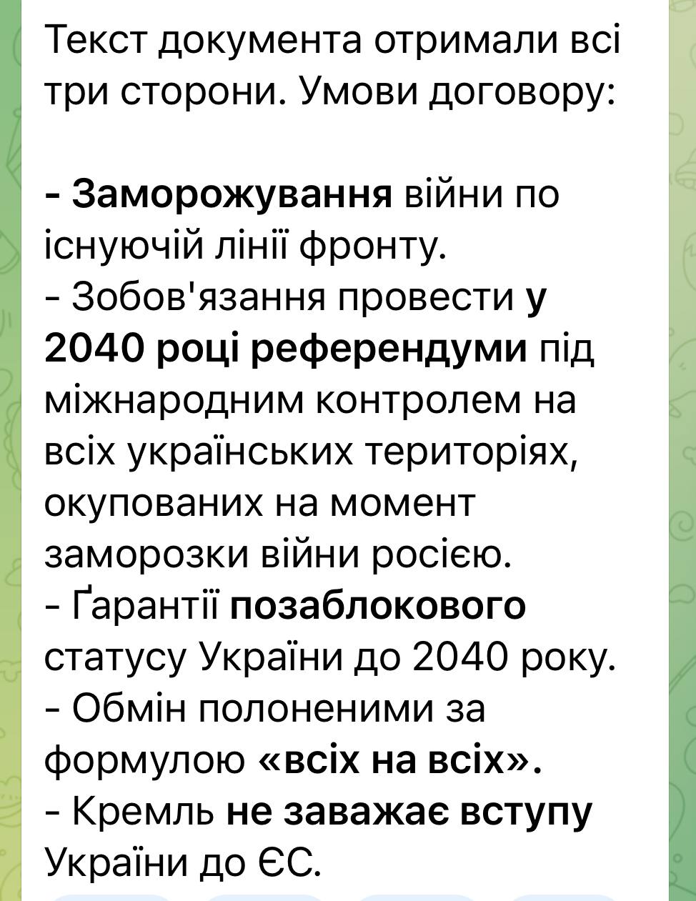Цей фейковий «план» передбачає збереження за рф окупованих територій України, референдум про їхню долю у 2040 році та інші пункти.