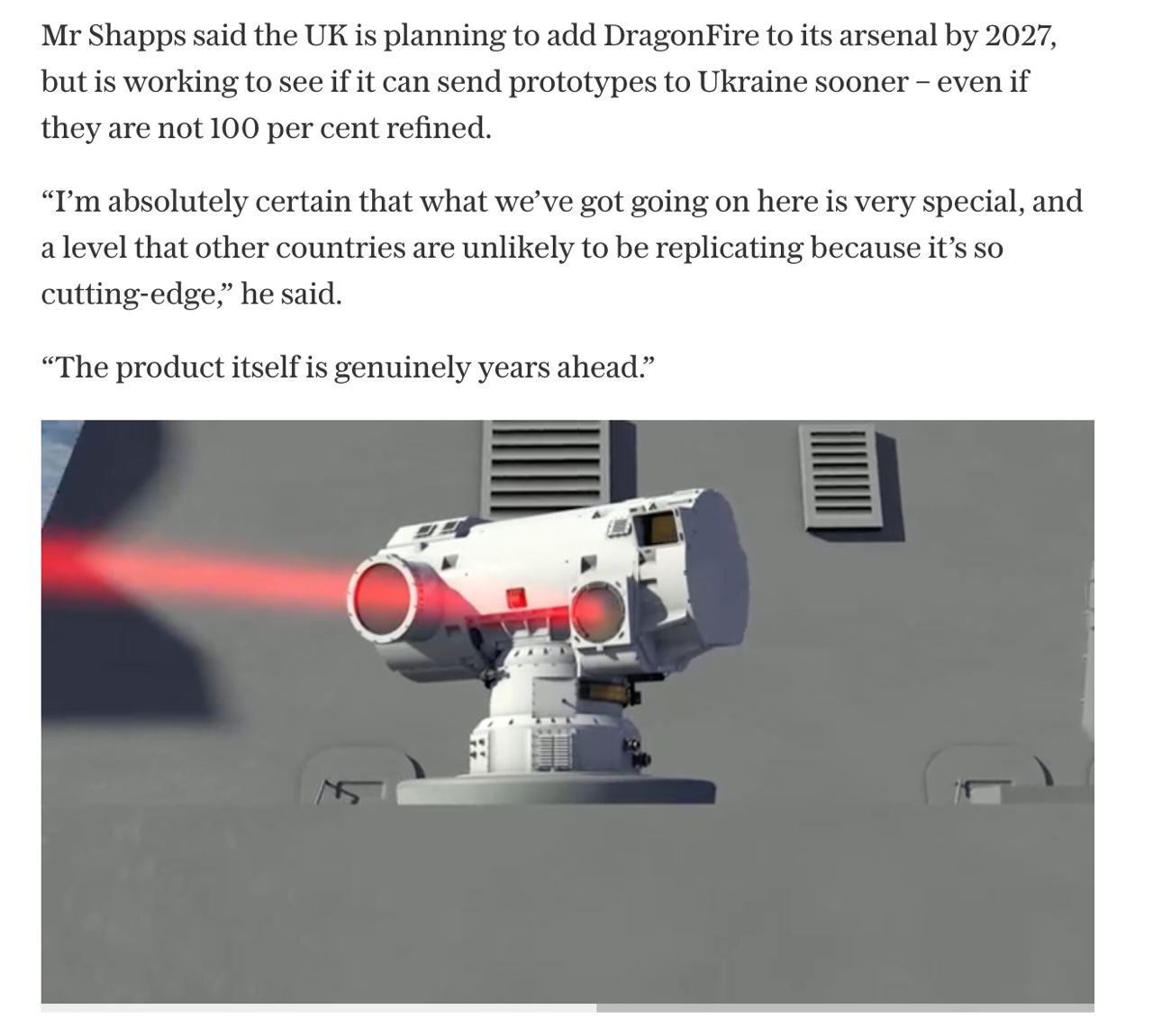 Йдеться про засіб для збивання дронів та ракет. Він має назву DragonFire. Це лазерний промінь, який здатний збивати БПЛА та ракети. Зброя невидима і безшумна, оскільки довжина хвилі світла становить близько одного мікрона, яке людське око не може помітити. Система достатньо потужна, щоб збивати снаряди, що рухаються швидше, ніж, наприклад, балістичні ракети.