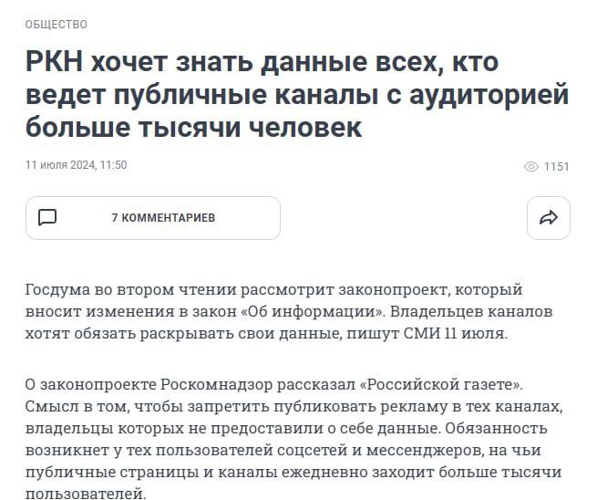 🔵 Роскомнадзор предложил законодательно урегулировать деанонимизацию авторов телеграм-каналов и блогеров. За нераскрытие имени им перекроют доходы от рекламы.