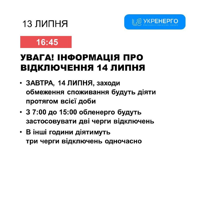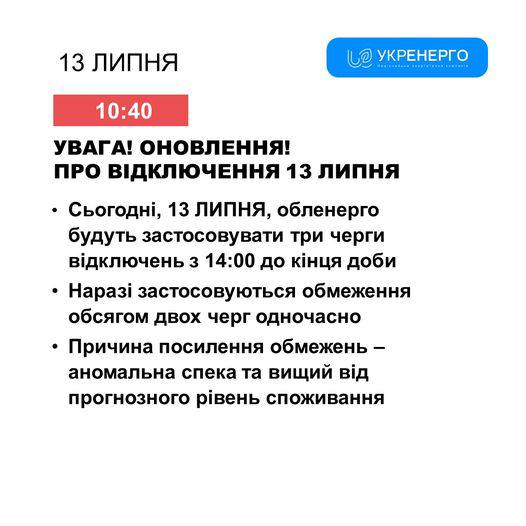 13 ЛИПНЯ, обленерго будуть застосовувати три черги відключень з 14:00 до кінця доби, - Укренерго