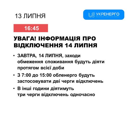 ON JULY 13, regional power distribution companies will apply three rounds of blackouts from 14:00 until the end of the day - Ukrenergo