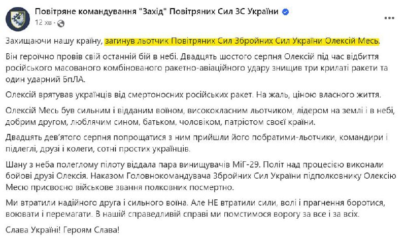 F-16 pilot Oleksiy Mes was killed that night.