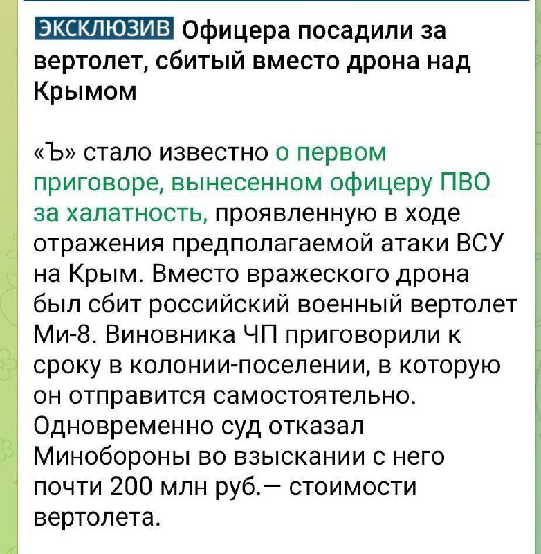 😁 A Russian air defense officer was sentenced to nearly 3 years in prison for mistakenly shooting down a Russian helicopter, mistaking it for a Ukrainian drone.
