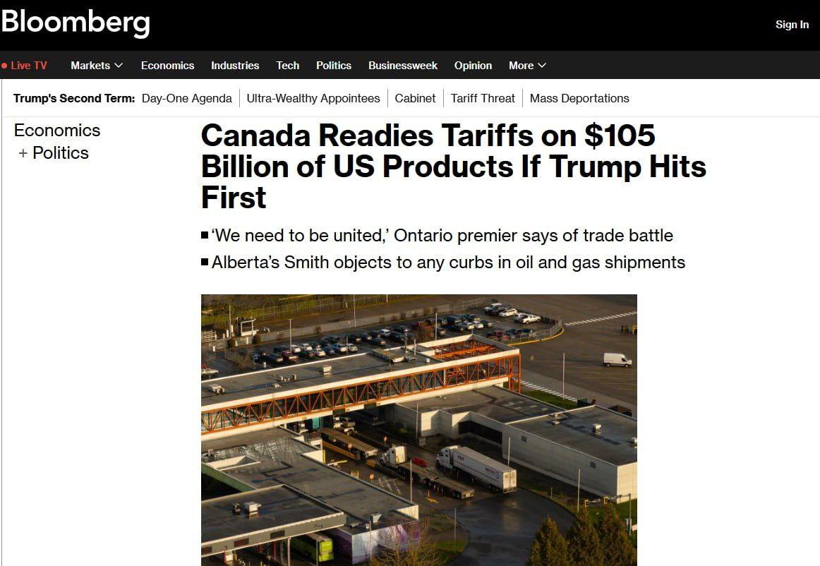 Canada is preparing to impose duties on $105 billion worth of U.S. goods if Trump approves tariffs of 25% on all Canadian goods - Bloomberg.