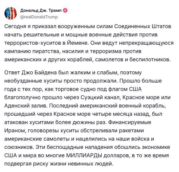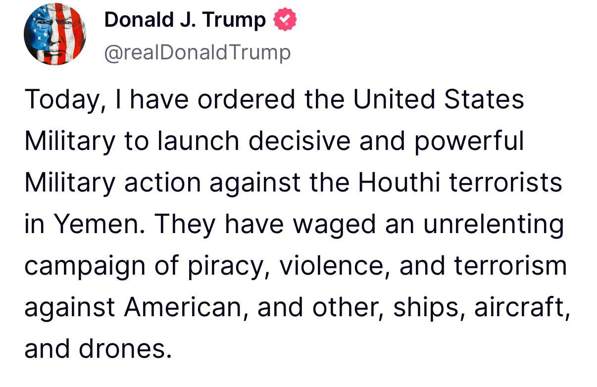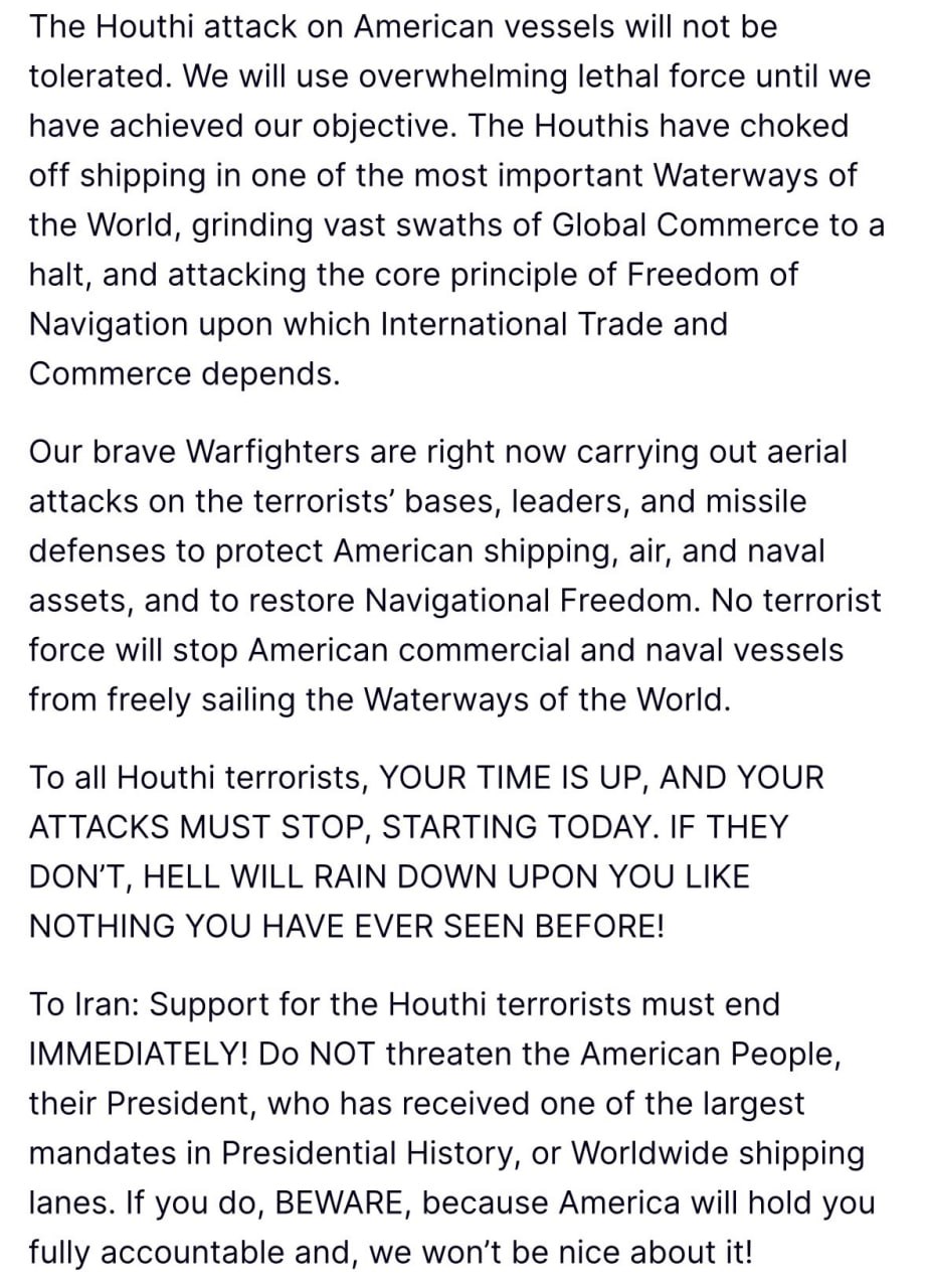 "Today, I ordered the U.S. military to launch a decisive and powerful military operation against Houthi terrorists in Yemen. Support for Houthi terrorists must stop IMMEDIATELY! Do not threaten the American people, their president, or the world's trade routes. If you do, be careful because America will hold you accountable to the fullest extent of the law.