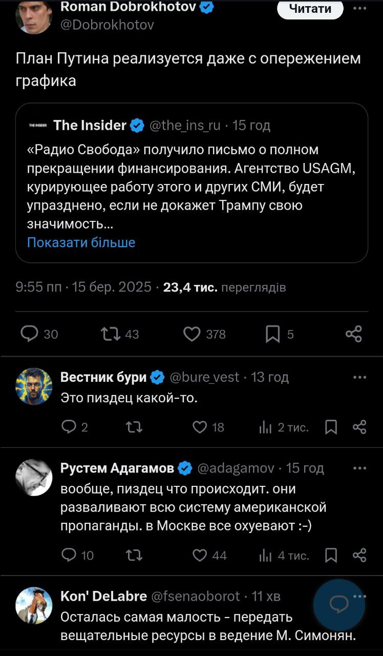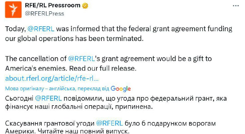 ❗️Агентство Global Media has terminated its grant agreement with Radio Liberty following Trump's executive order to cut seven US federal agencies, says Radio Liberty President and CEO Stephen Capus