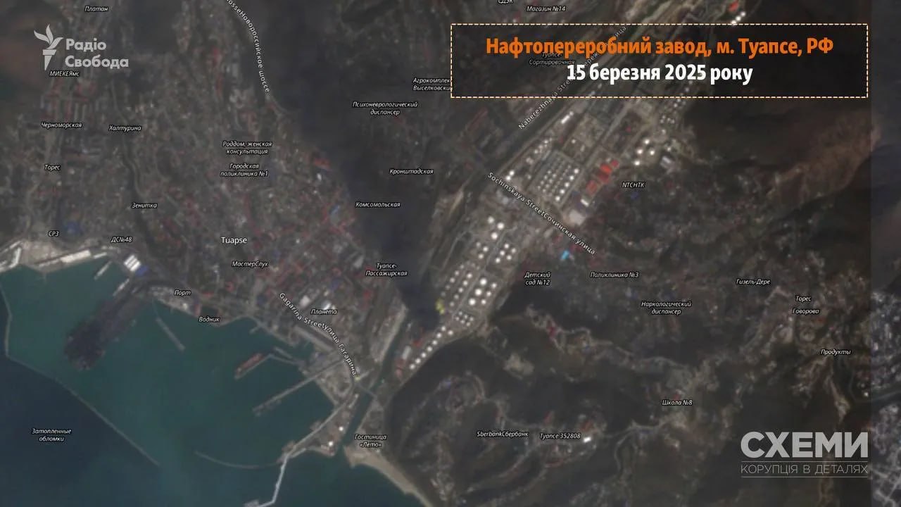 After an attack on the oil refinery in Tuapse (Krasnodar Territory, Russia) on the night of March 14, the fire has been burning for over a day. As of March 15, satellites recorded smoke over the facility.