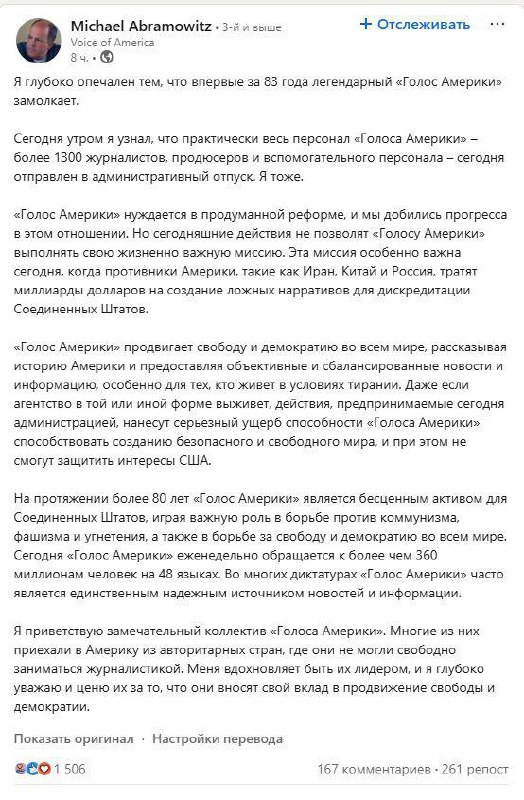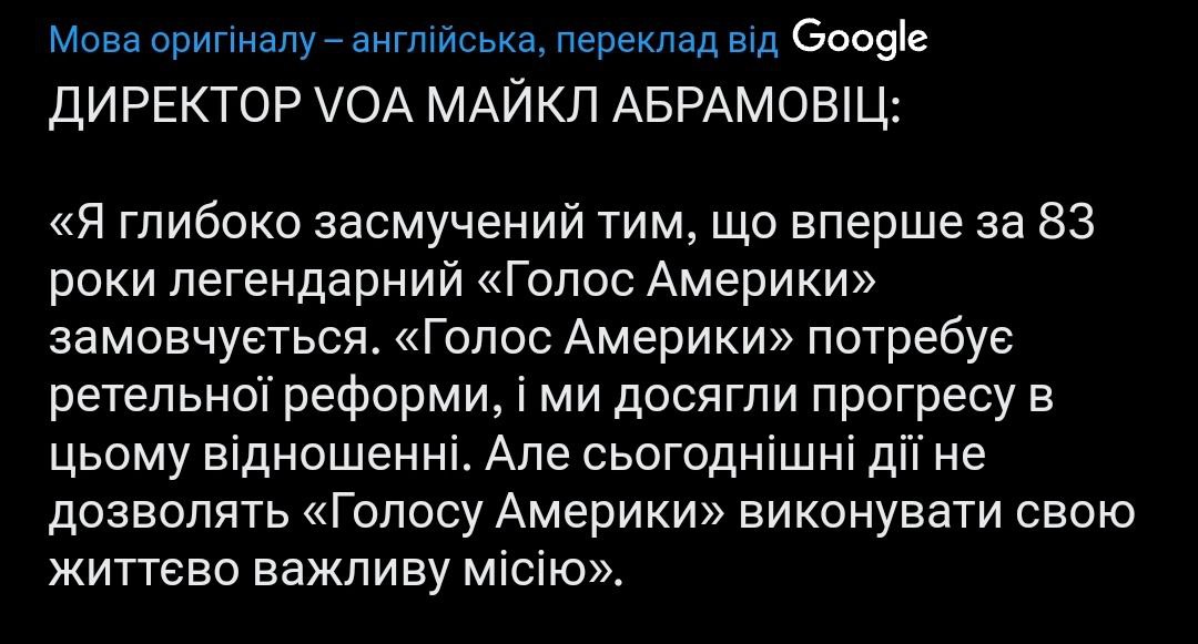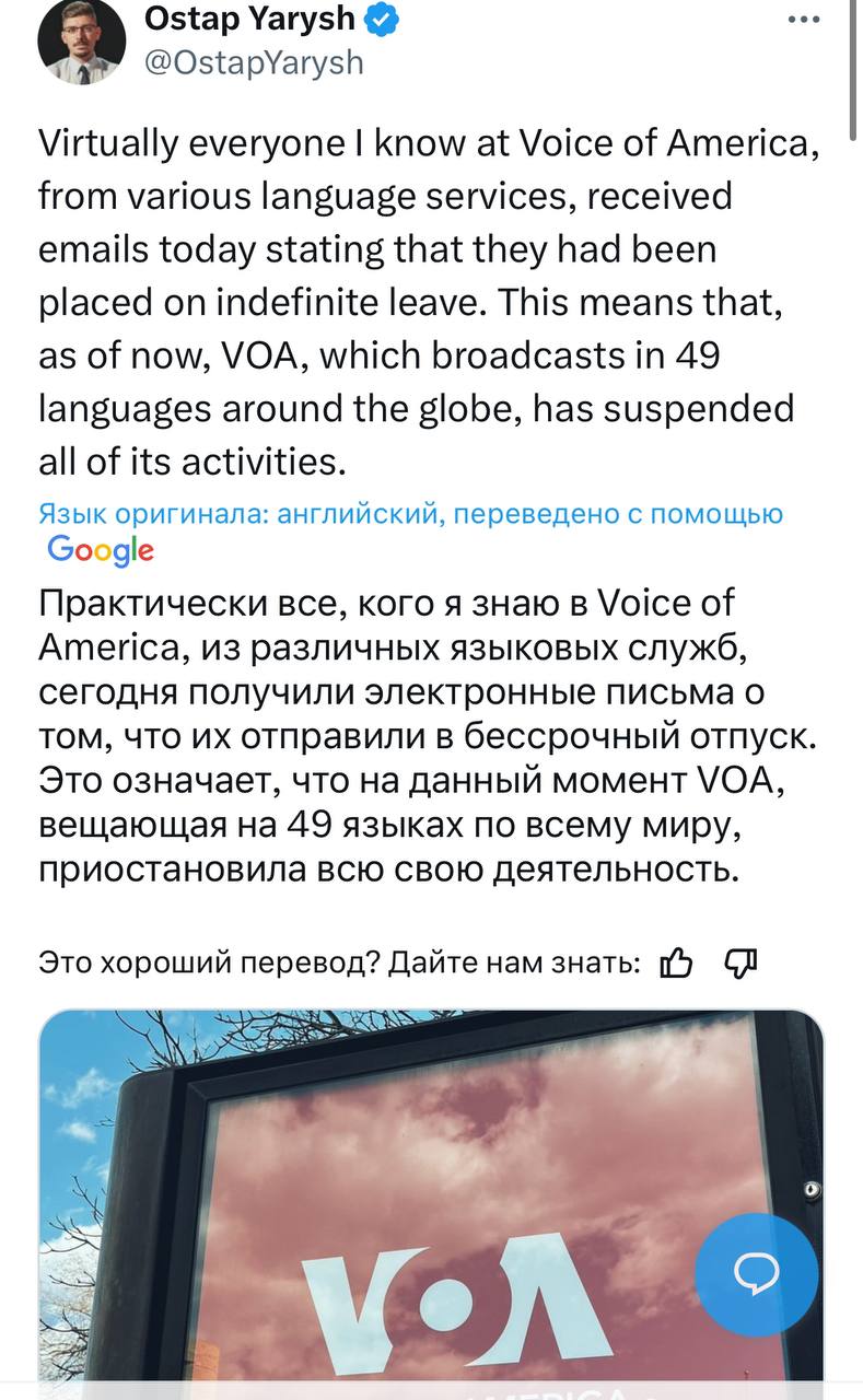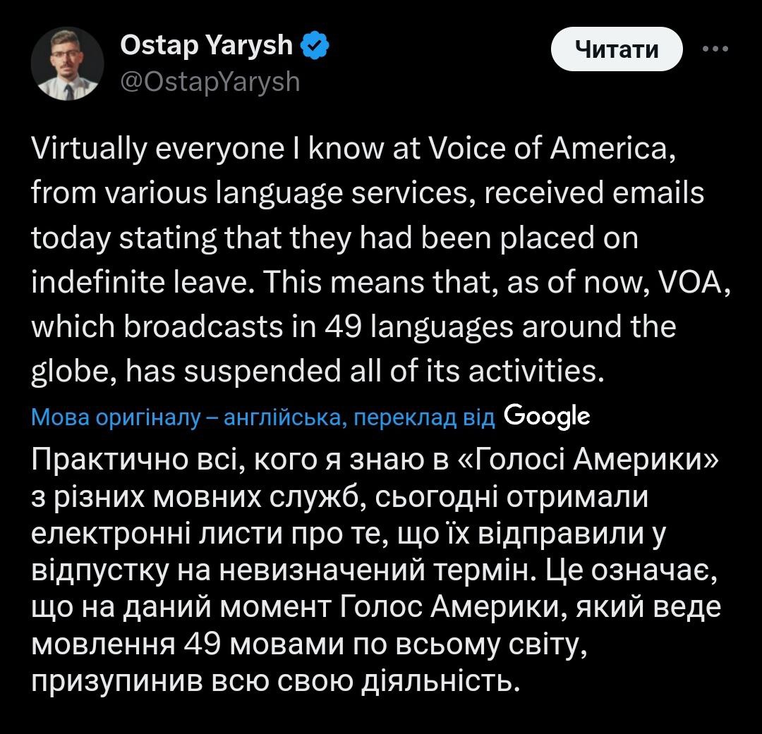 In addition, journalist Ostap Yarysh writes that now we can actually talk about the suspension of the Voice of America. According to him, almost everyone he knew in the media from various broadcasting services received letters of forced leave.