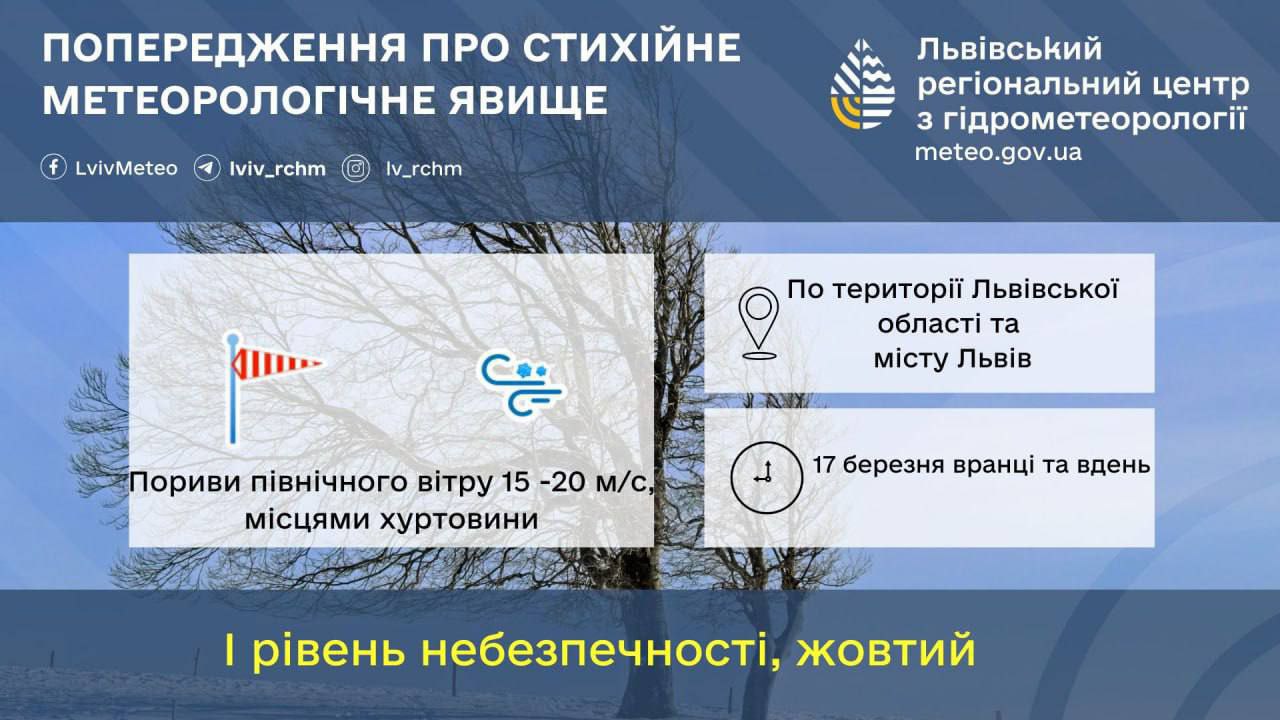 The wind will be northerly with a speed of up to 15-20 m/s. In the region, the temperature will range from -2 to +3 degrees above zero during the day, and in Lviv - 0-2 degrees.