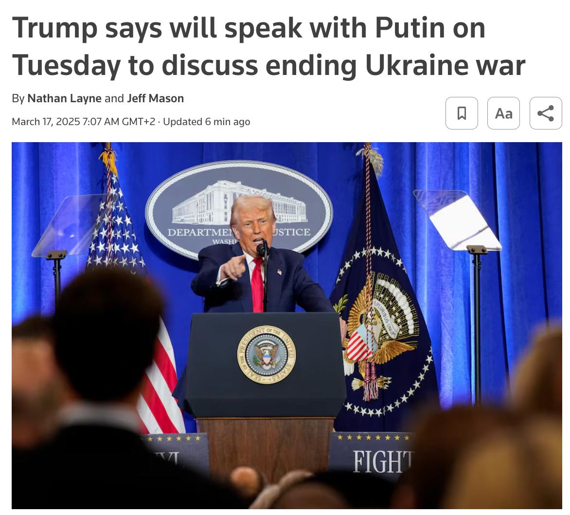 🔵 US President Donald Trump told reporters aboard Air Force One on a flight from Florida to Washington that he plans to talk to Vladimir Putin about ending the war against Ukraine by phone on March 18. This was reported by Reuters.