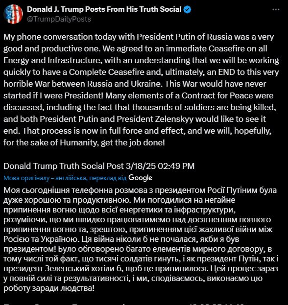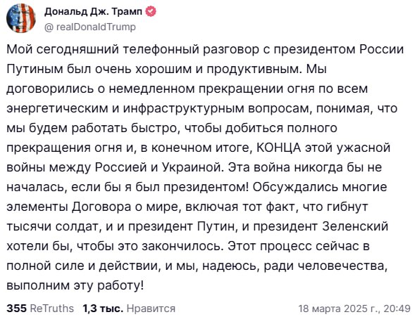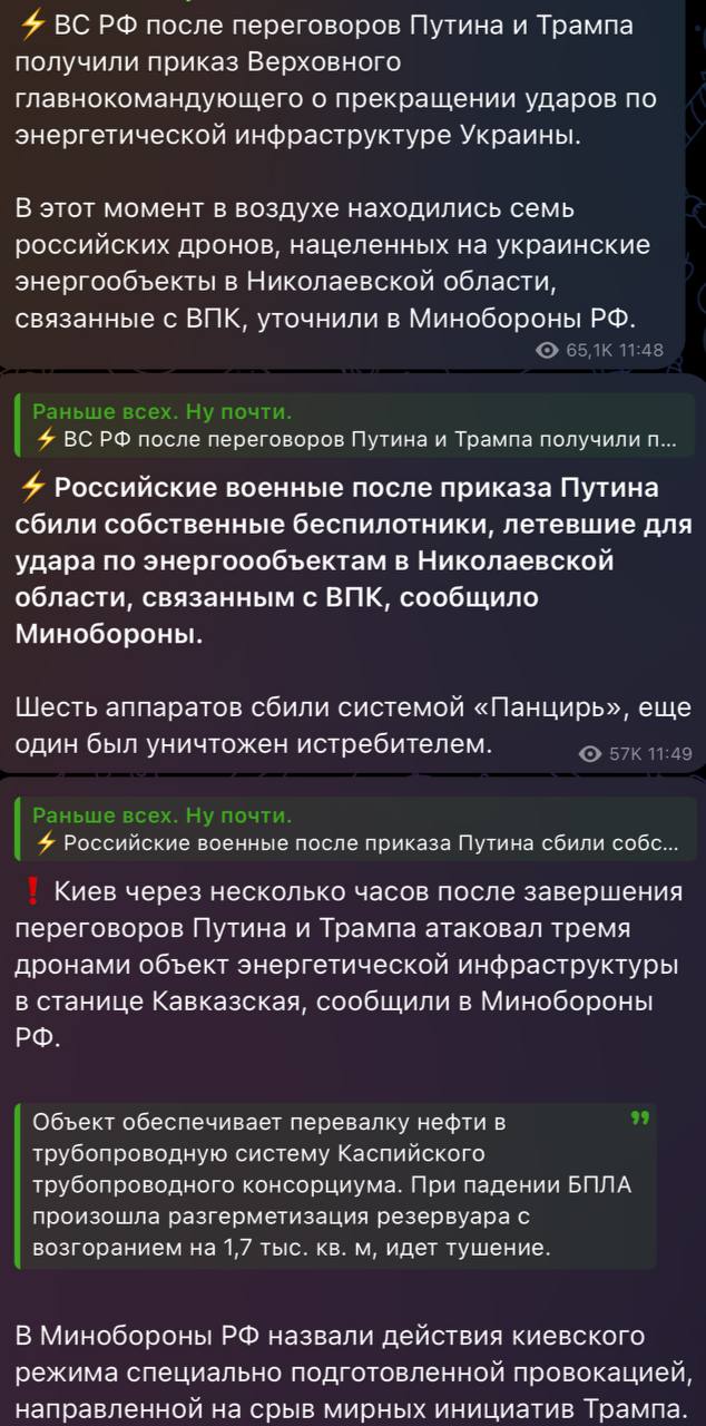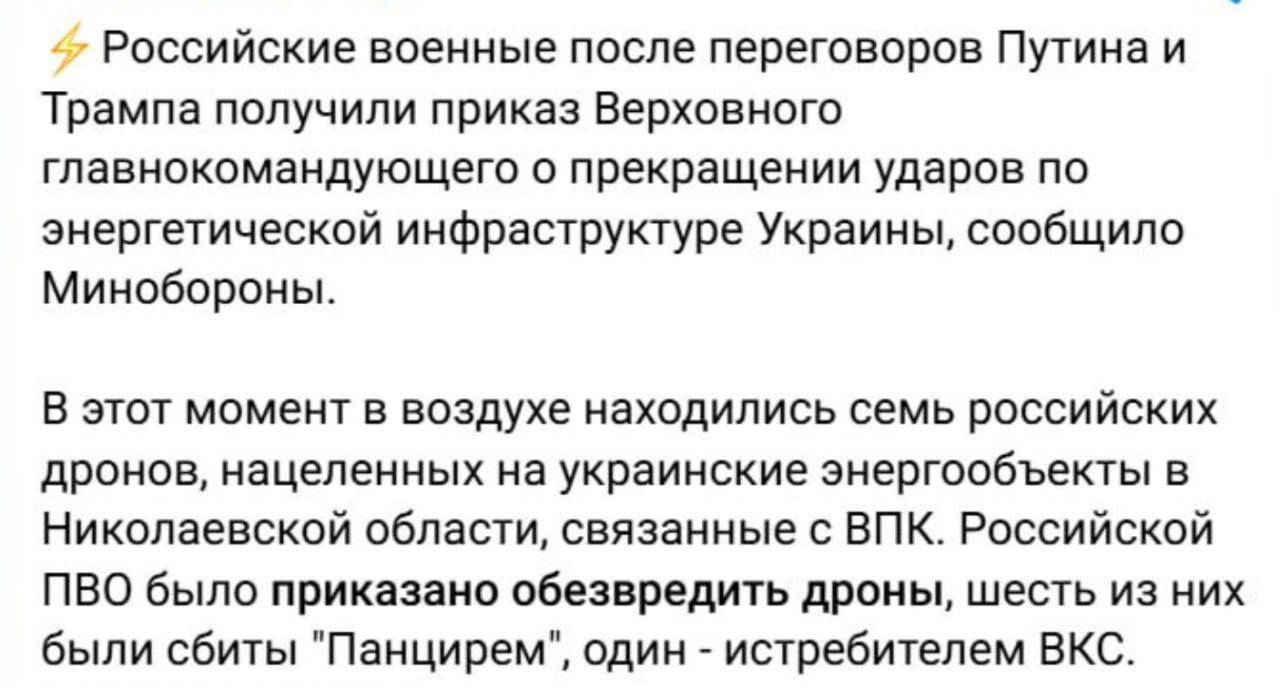 The Russian Defense Ministry says that after Trump's conversation with Putin, the Russians immediately shot down their drones that were already flying over our energy infrastructure.