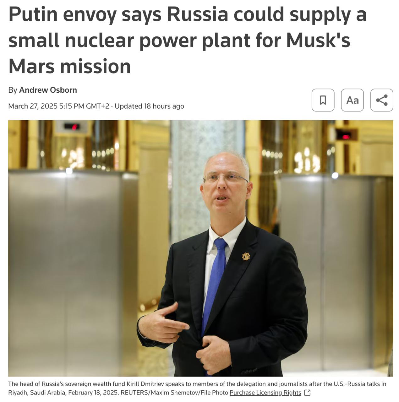 This is the second time this month that Dmitriev has spoken about possible cooperation with Musk.