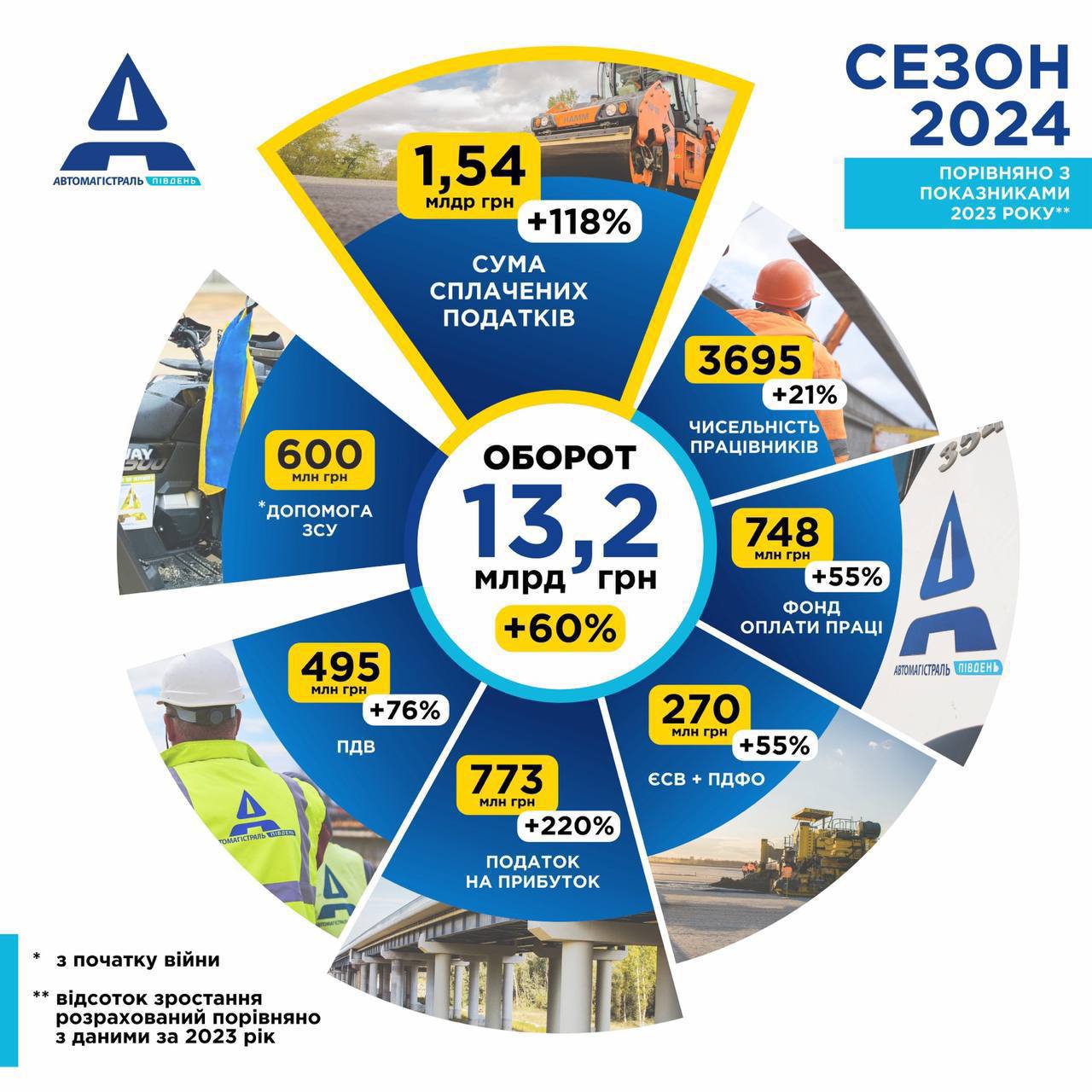 Profit tax increased to UAH 773 mln (+220%). VAT up to 495 million UAH (+76%). More than 600 new jobs were created in Avtomagistral Yug. The number of employees increased to almost 3.7 thousand (+21%). Labor remuneration fund - up to UAH 748 mln (+55%). Taxes on payroll have also increased, totaling UAH 270 mln (+55%).