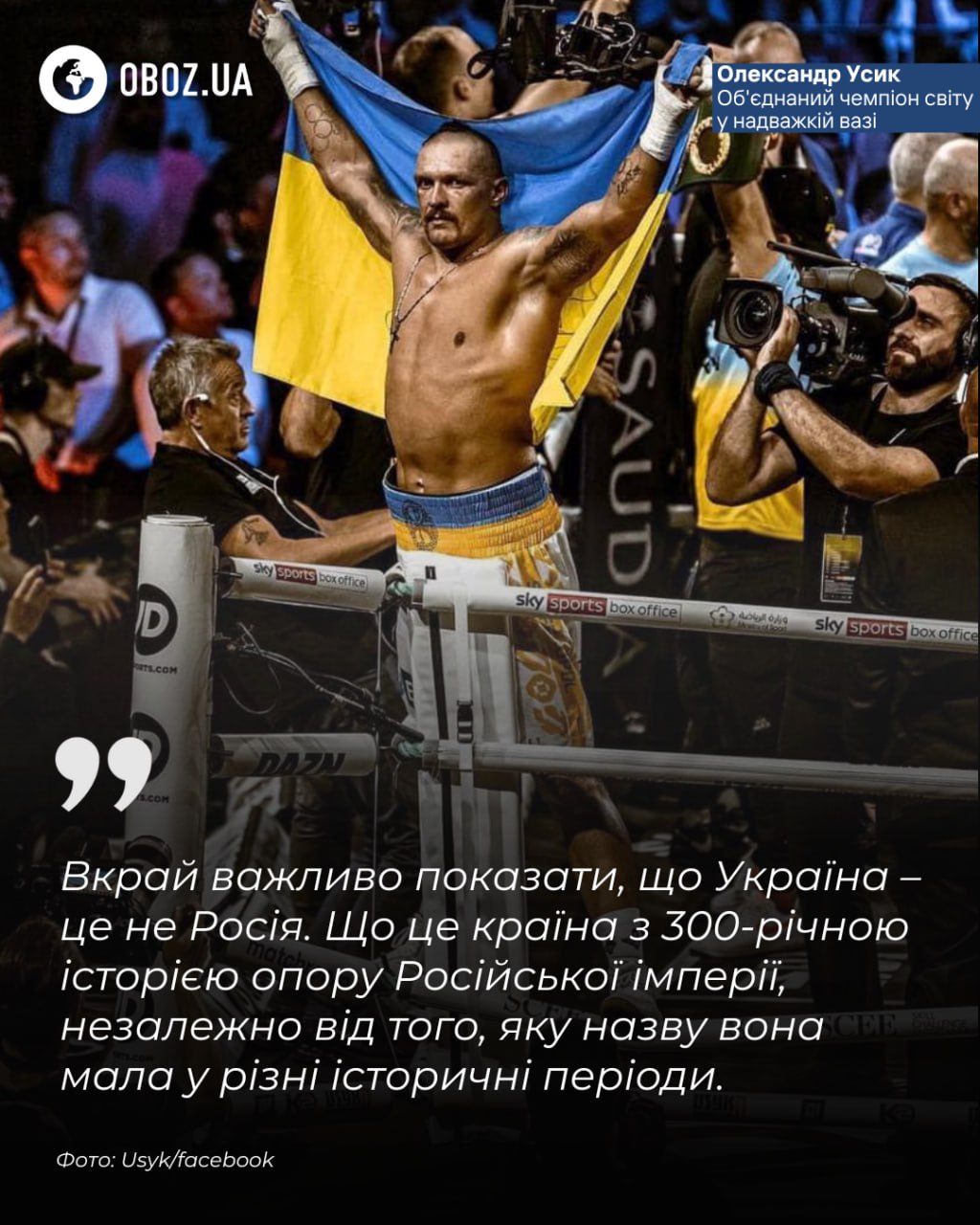 The unified world heavyweight champion Oleksandr Usyk reminded that Ukraine has been resisting Russian imperial aggression for centuries. The 38-year-old boxer emphasized that the world must do everything to end the criminal war in our country and prevent its recurrence.