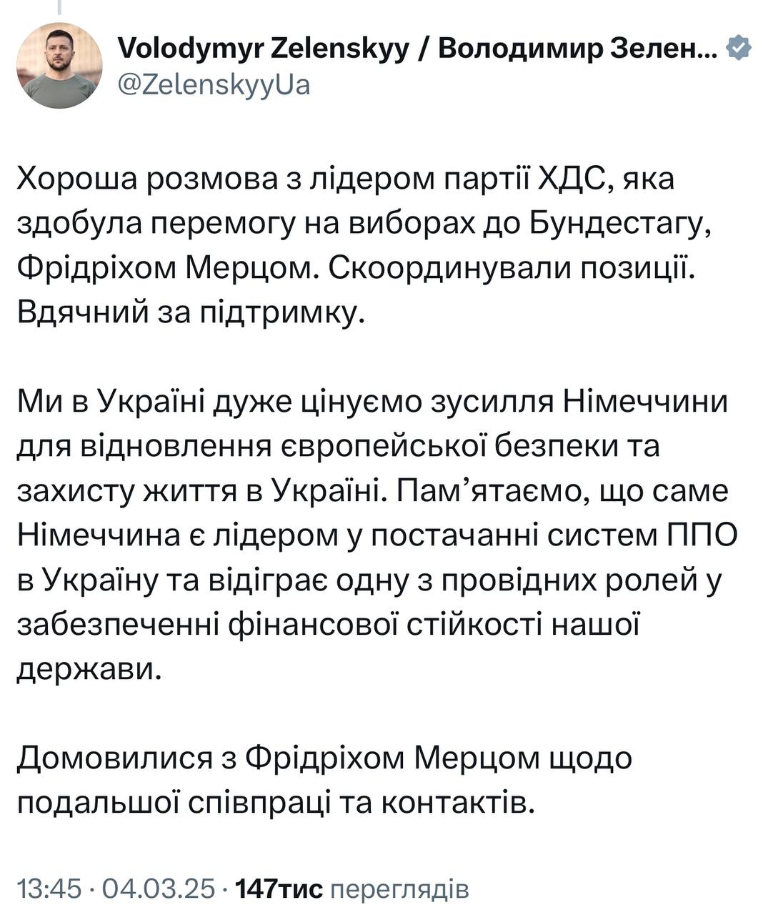 According to Volodymyr Zelenskyy, they also agreed with Friedrich Merz on further cooperation and contacts.