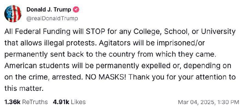 Students will be imprisoned for illegal rallies in the US, and universities will lose federal funding, - Trump.