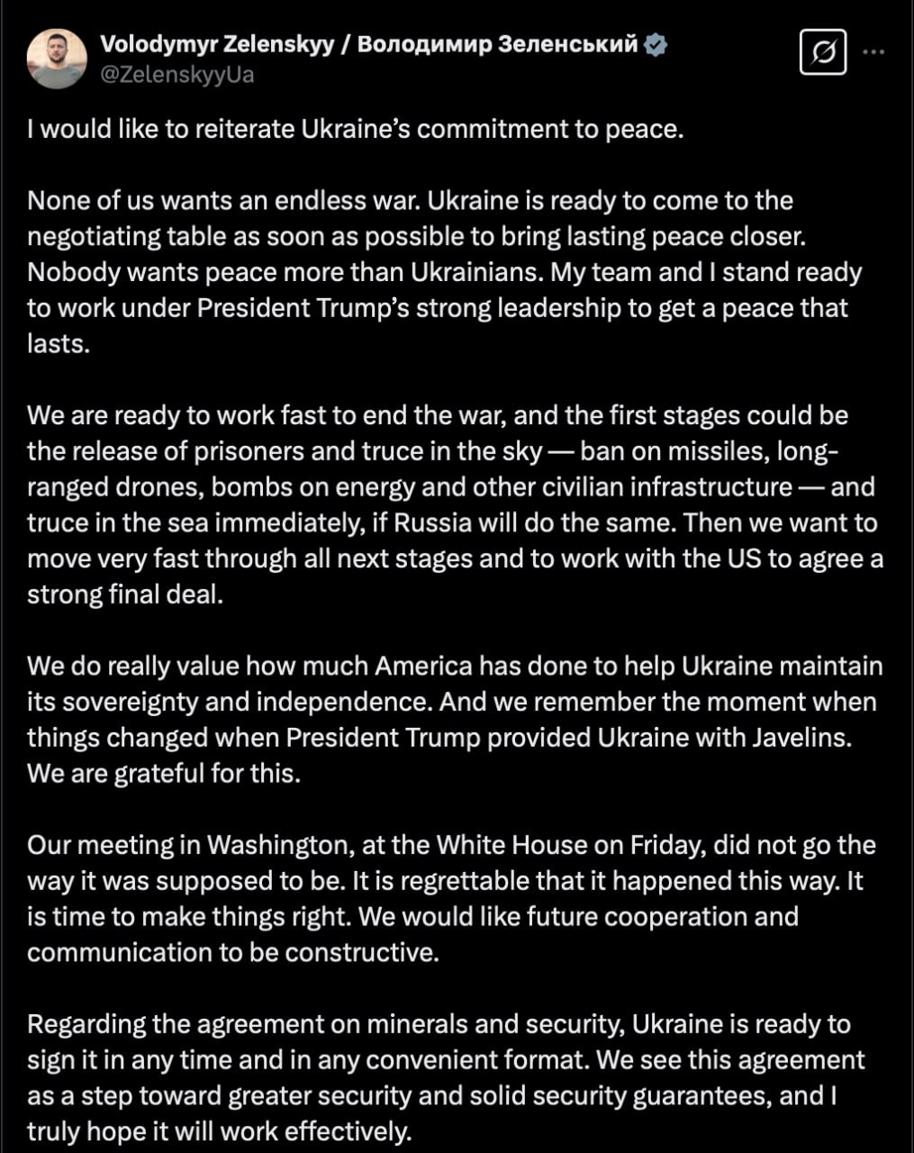 Our meeting in Washington, at the White House, on Friday did not go as planned. It is a shame that this happened. It's time to make things right. We would like to ensure that further cooperation and communication will be constructive.