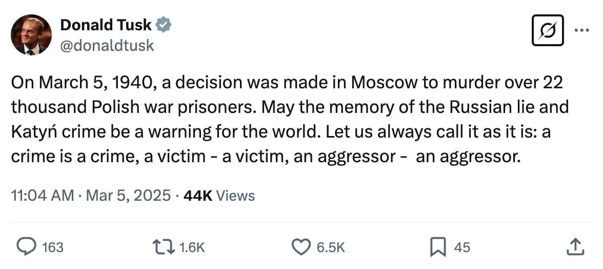 "On March 5, 1940, Moscow decided to kill more than 22,000 Polish prisoners of war. Let the memory of the Russian lies and the Katyn crime be a warning to the whole world. Let us always call things by their proper names: a crime is a crime, a victim is a victim, an aggressor is an aggressor," wrote Polish Prime Minister Donald Tusk.