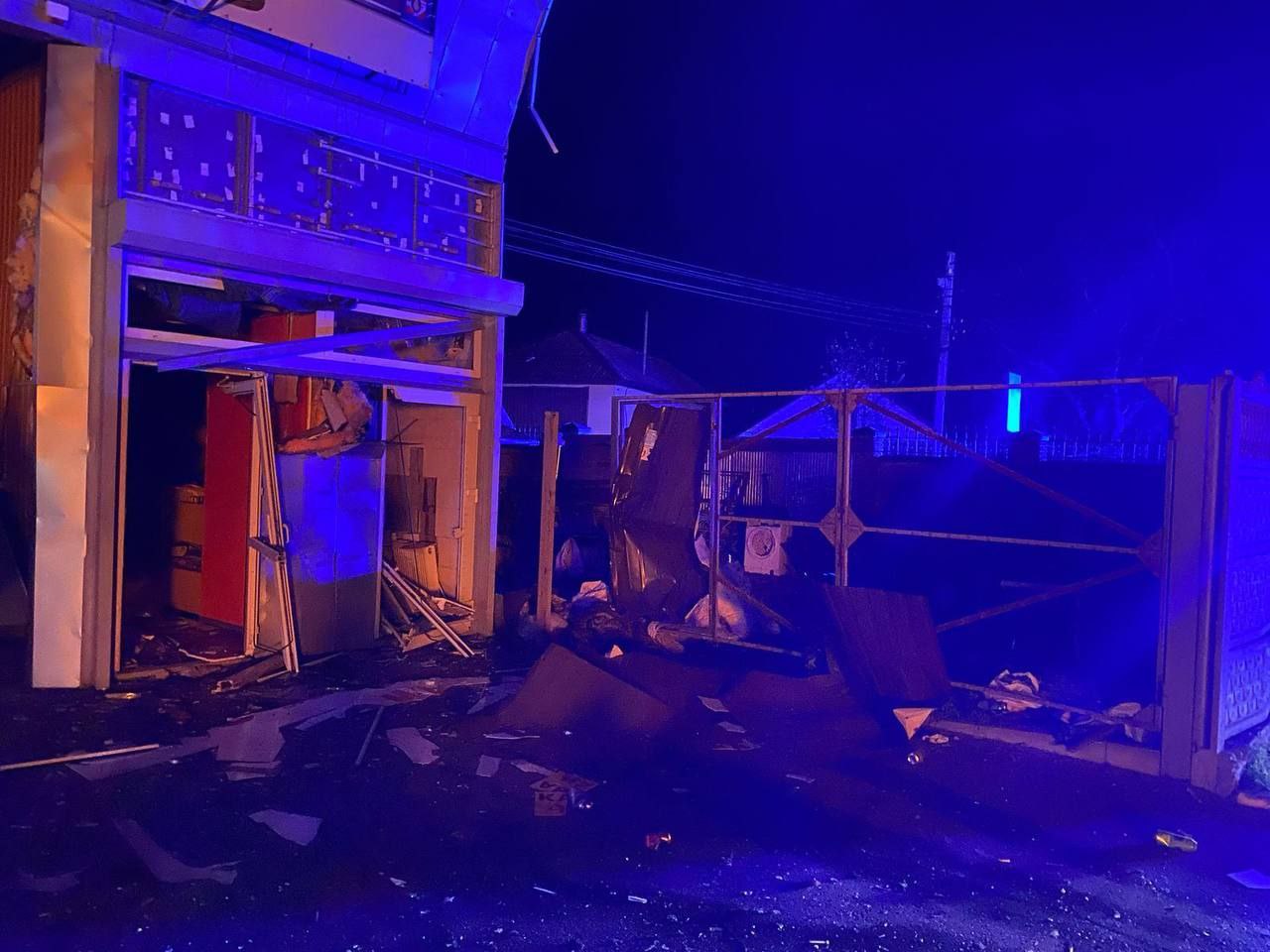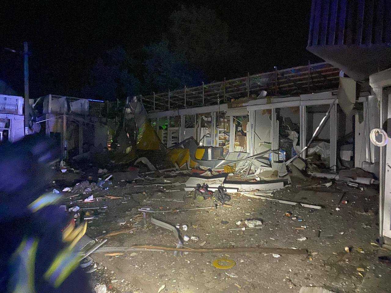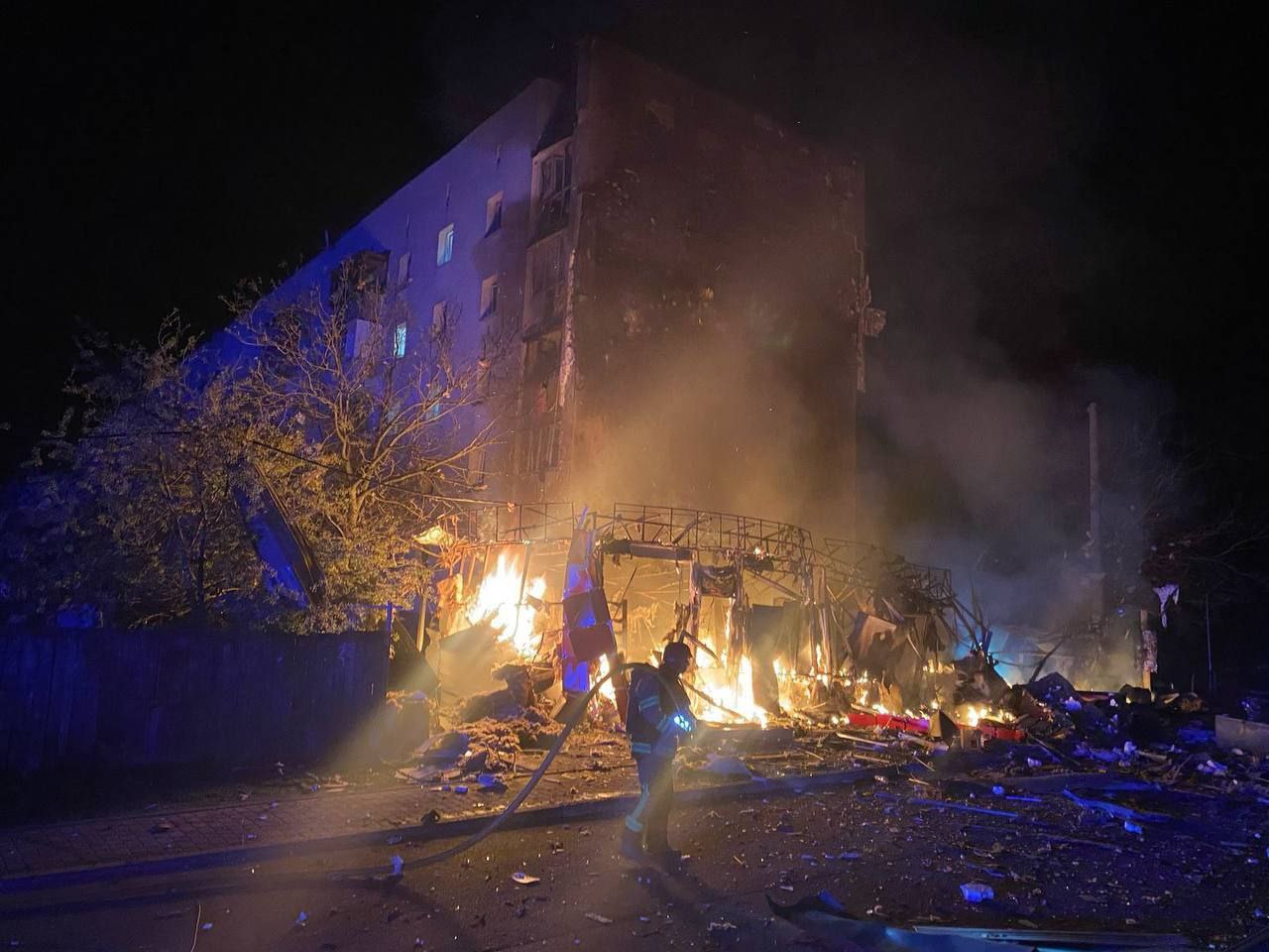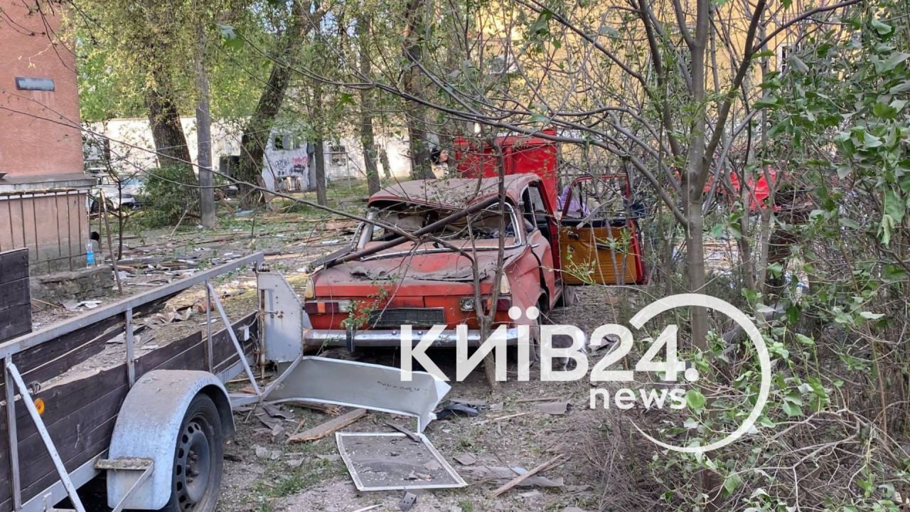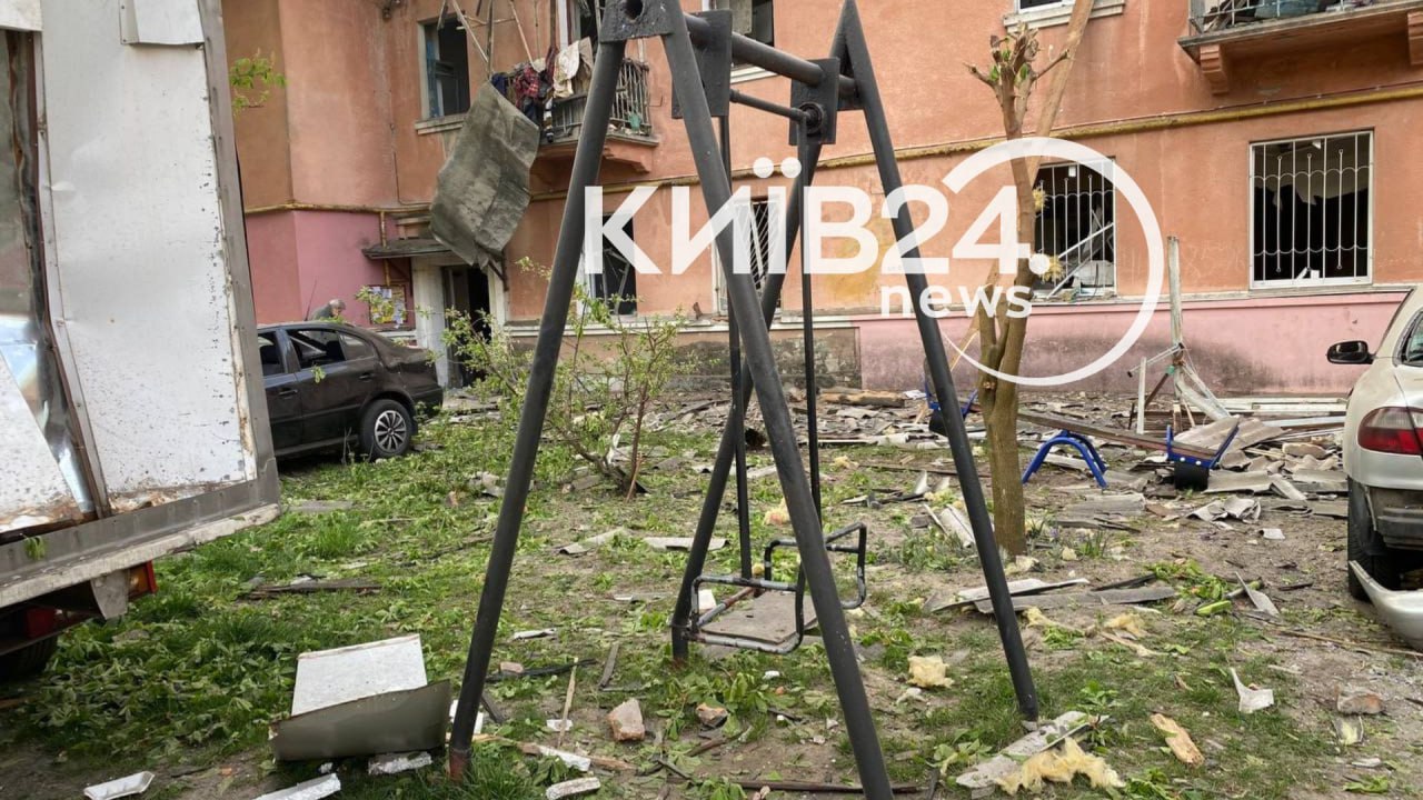 Three five-story residential buildings were damaged there. A fire broke out on the roof of one of them and was extinguished. Four shops, eight cars, and a public transportation stop were also damaged.