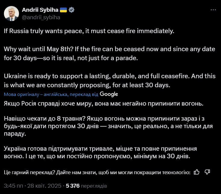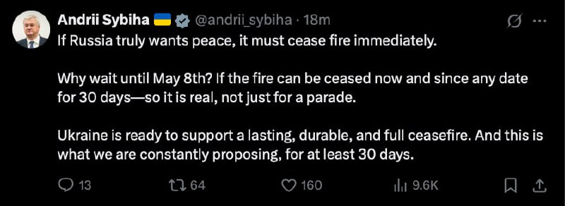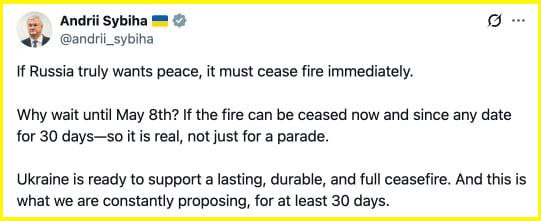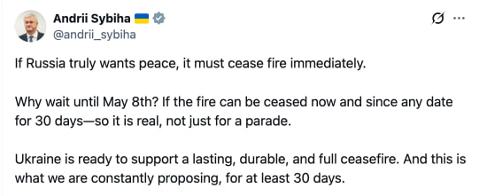 "Why wait for May 8? If it is possible to cease fire now, from any date and for 30 days, it should be real, not just for a parade. Ukraine is ready to support a long-lasting, reliable and complete ceasefire. And we constantly offer it - for at least 30 days." - Foreign Minister Sibiga in response to the unilateral ceasefire in honor of the Victory Day
