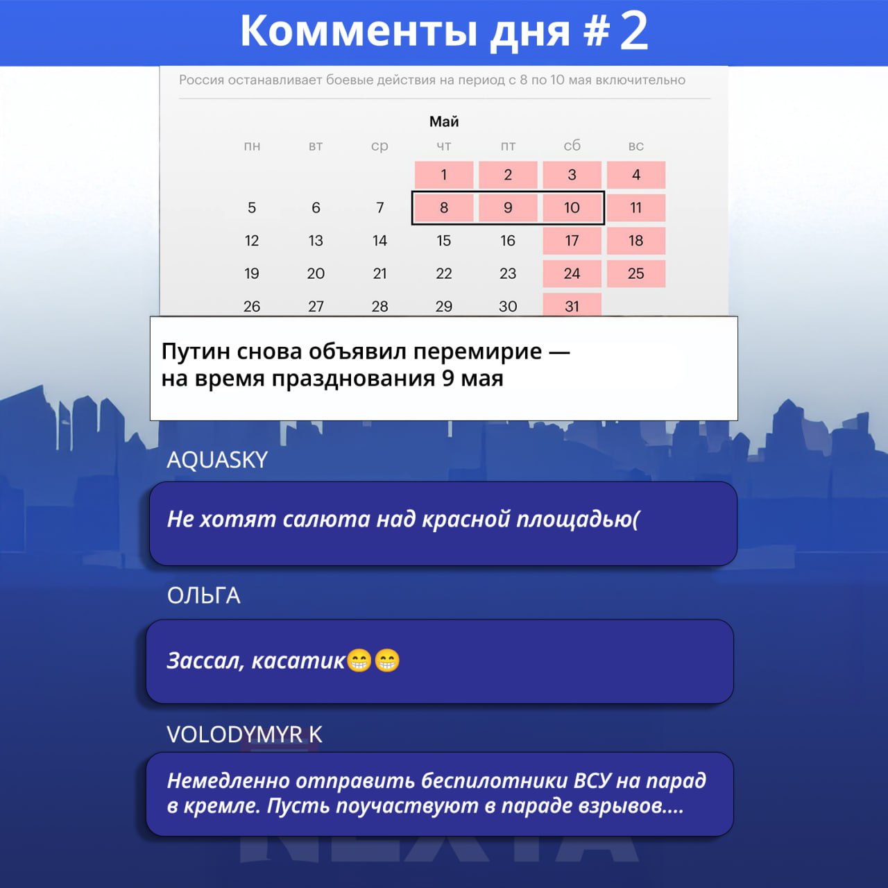 "Why wait until May 8? If the ceasefire can be stopped now and from any date within 30 days, then it is real, and not just for a parade. Ukraine is ready to support a long-lasting, durable and complete ceasefire. And this is what we constantly propose, for at least 30 days," Foreign Minister Andriy Sybiga wrote on social networking site X.