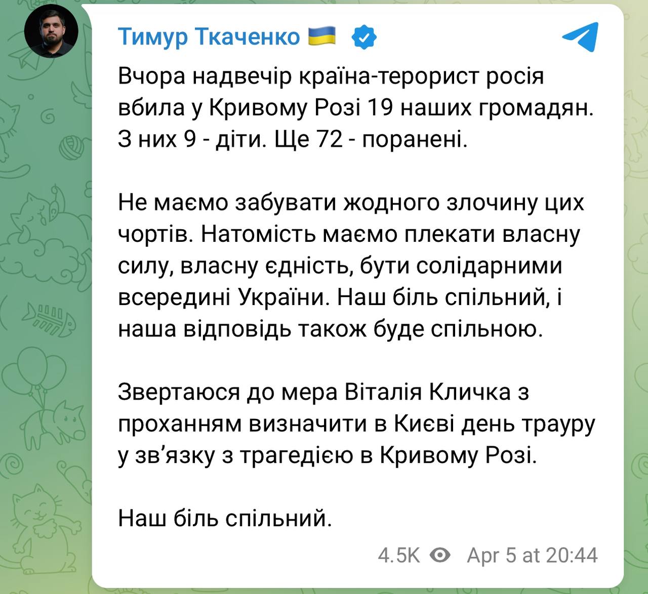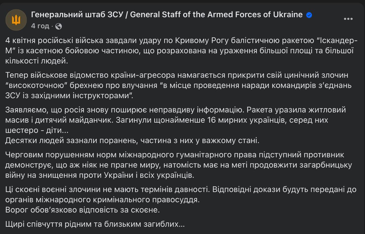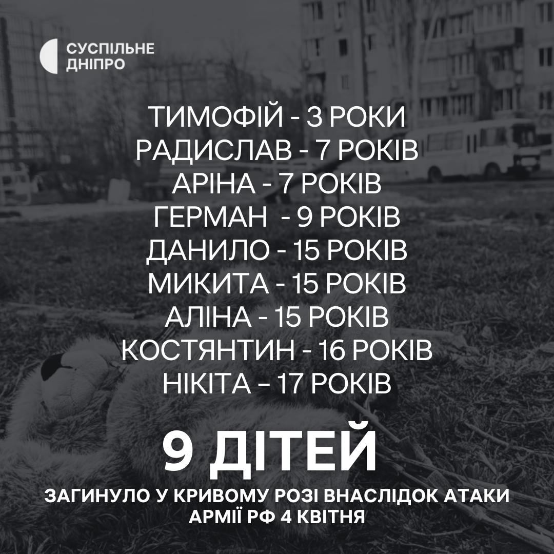 n the evening of Friday, April 4, Russian invaders fired a ballistic missile at Kryvyi Rih, killing 18 people, 9 of whom were children. Dozens more civilians were injured. World leaders reacted to another war crime by Russia.