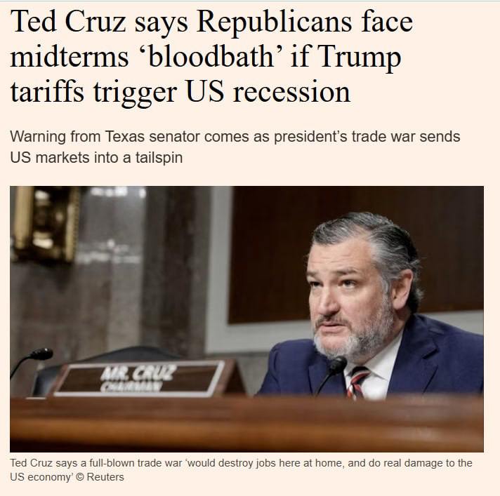 If Trump's duties will send the U.S. economy into recession, the Republicans are waiting for a "bloodbath" in the midterm elections to Congress, which will be held in 2026. This was stated by Republican Senator Ted Cruz, writes the Financial Times.