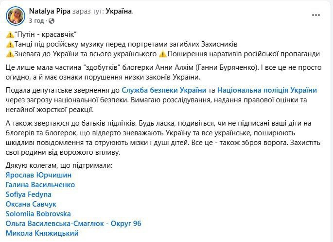 Over time, the media reported that law enforcement agencies had already opened three criminal proceedings in the case of Anna Alkhim under Articles 161, 111 (high treason) and 364 (abuse of power or position) of the Criminal Code of Ukraine. In particular, the SBU has sent information about the blogger's activities and statements to experts for investigation.